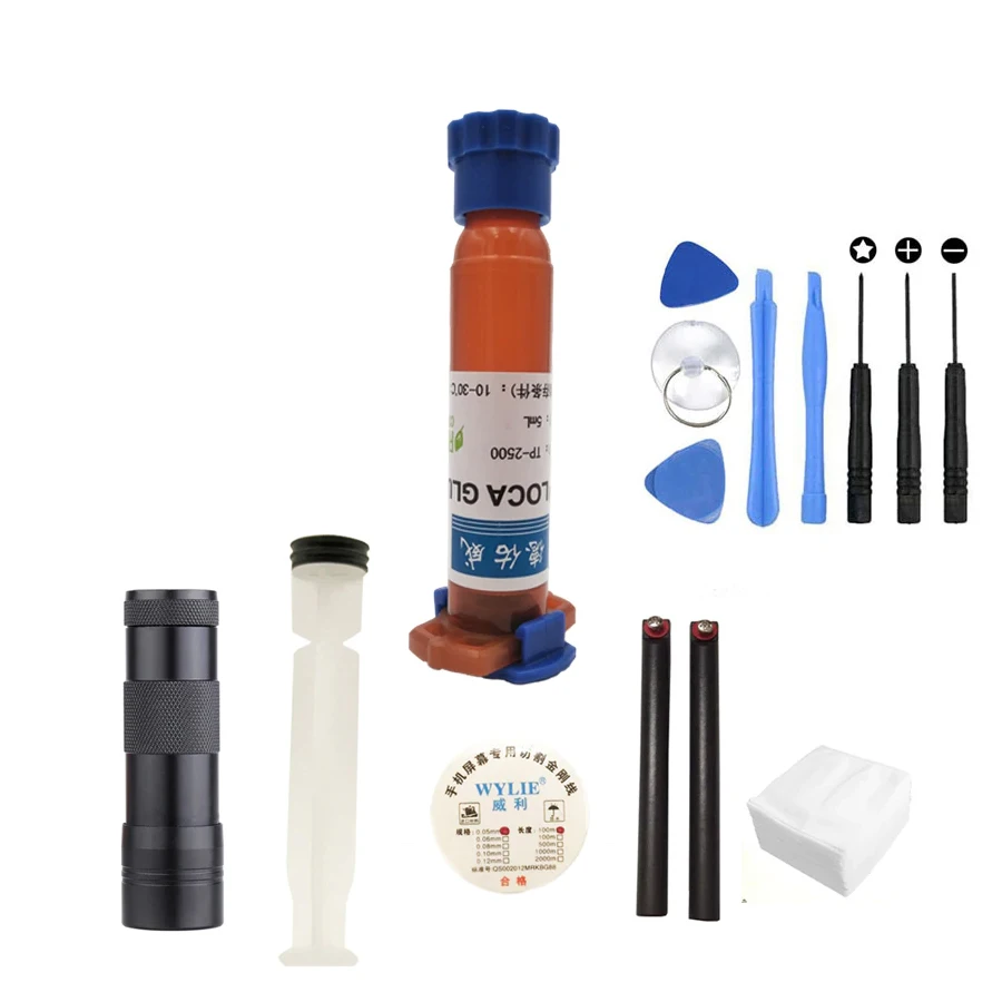 LOCA tp-2500 УФ-клей 5 мл + УФ-отверждающий светильник + режущий провод + одежда + нож для очистки + инструмент для ремонта ЖК-экрана телефона