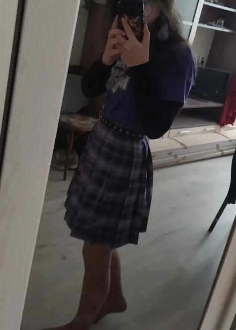 Юбочка пришла быстро, за две недели до СПб. Думала, что цвет тусклый, и по фотографиям так кажется, но на самом деле она чуть ярче и очень приятная на глаз. Складки ооочень хорошие, ткань грубая, но приятная на ощупь. Юбка не короткая, очень рада. Советую, в общем))) (P.S. лучше брать на пол размера или размер больше, хотя хз))