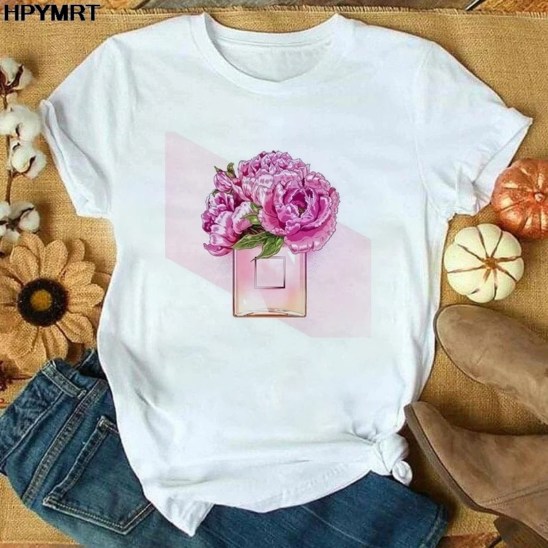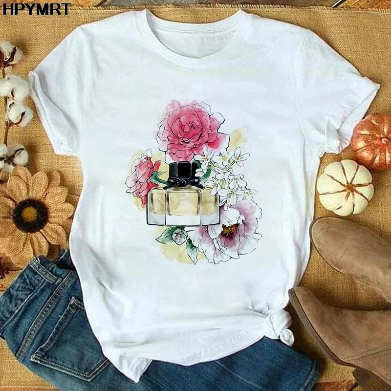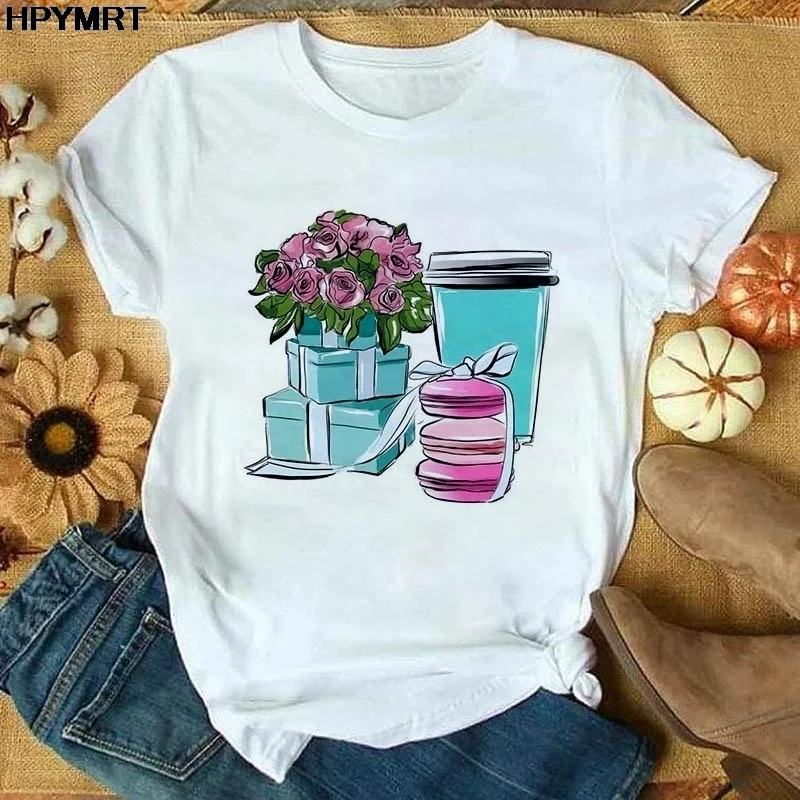 Новинка, красивая футболка с цветочным принтом, кофейным принтом, женская футболка с коротким рукавом, женские топы, модная футболка, Женская графическая Футболка Harajuku, женские футболки, одежда