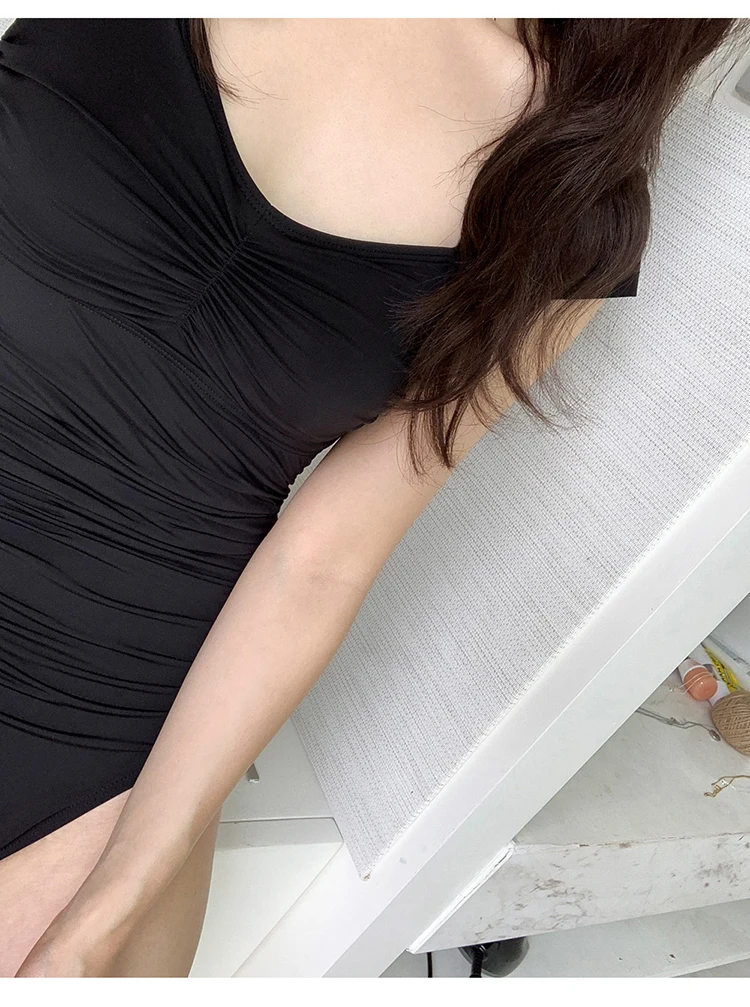 Слитный купальник с коротким рукавом, Женский однотонный черный куп...