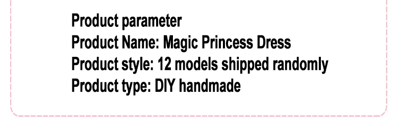 Параметр продукта Наименование товара: Волшебное платье принцессы Стиль изделия: 12 моделей отправляются случайным образом Тип товара: ручная работа