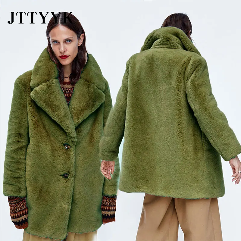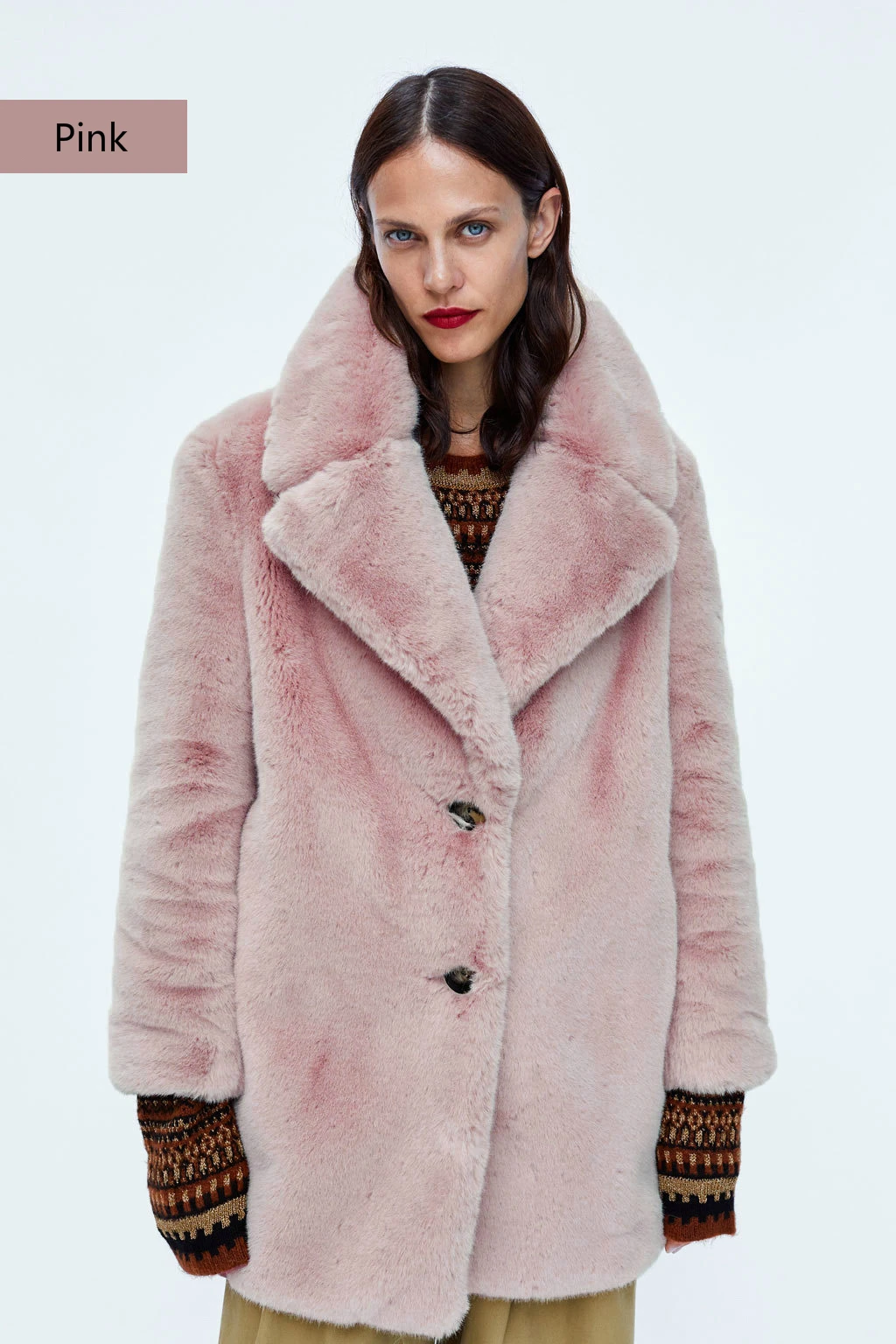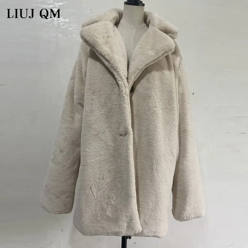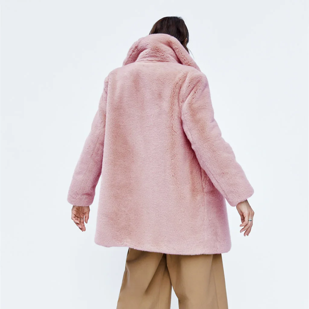 Женское зимнее пальто средней длины из искусственного меха кролика, с отворотом и длинными рукавами