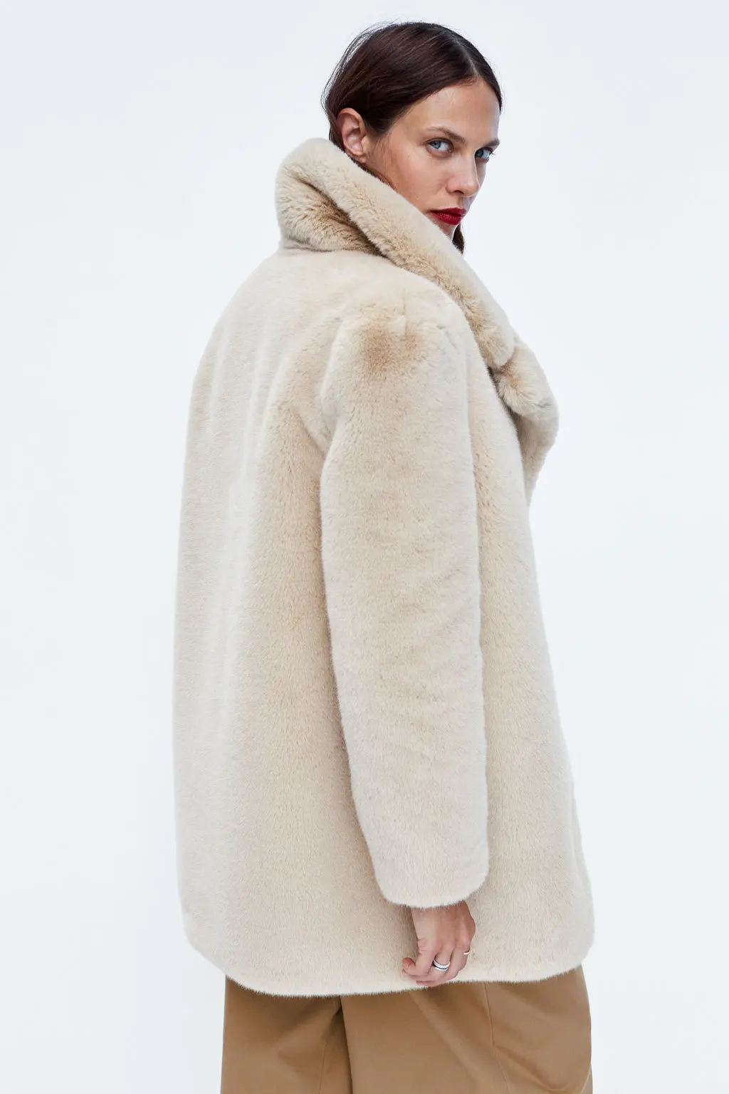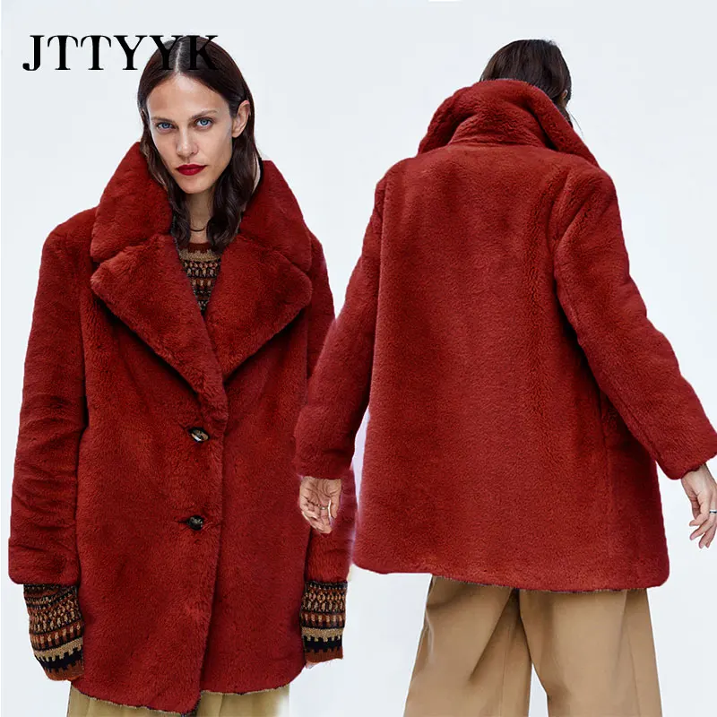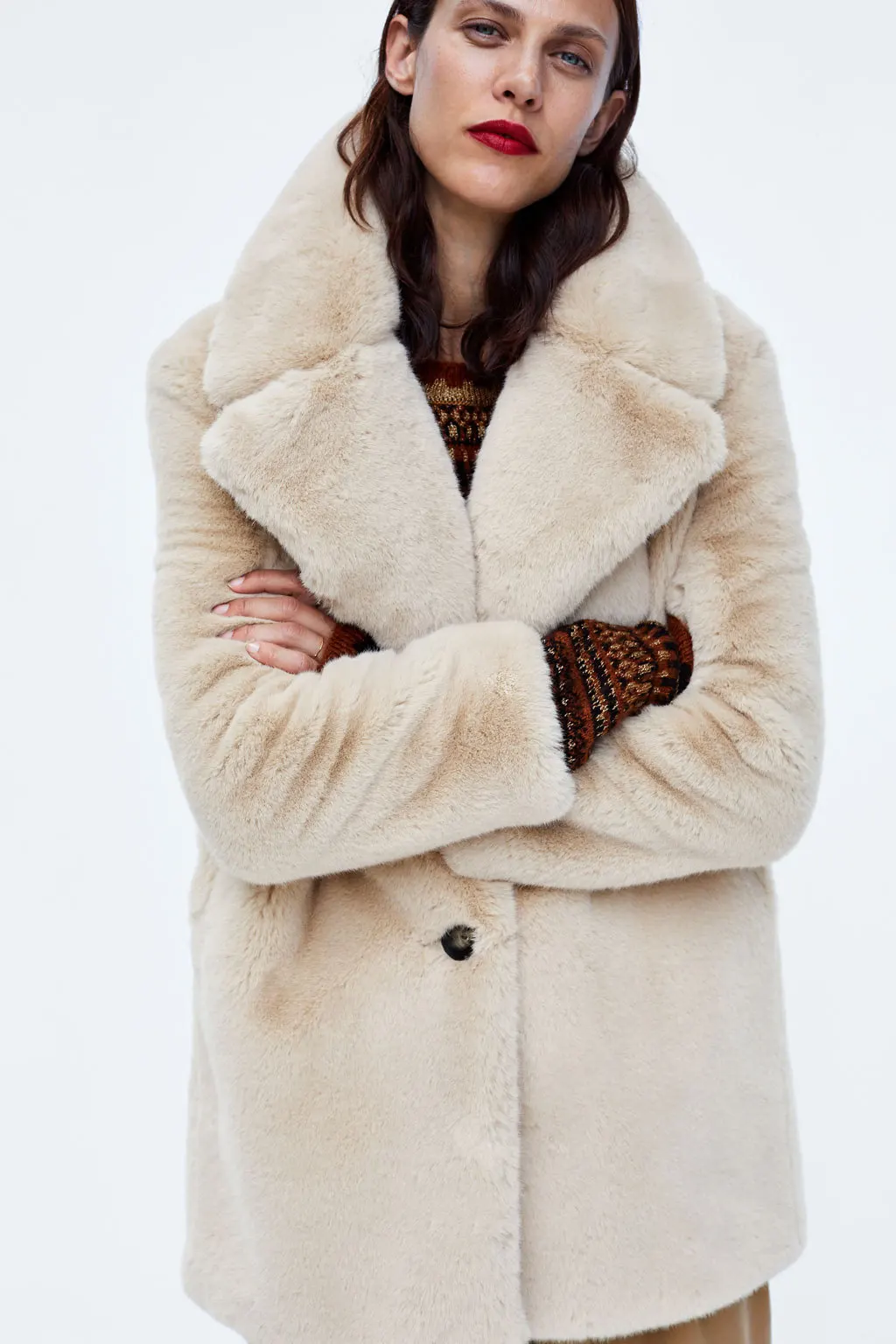 Женское зимнее пальто средней длины из искусственного меха кролика, с отворотом и длинными рукавами