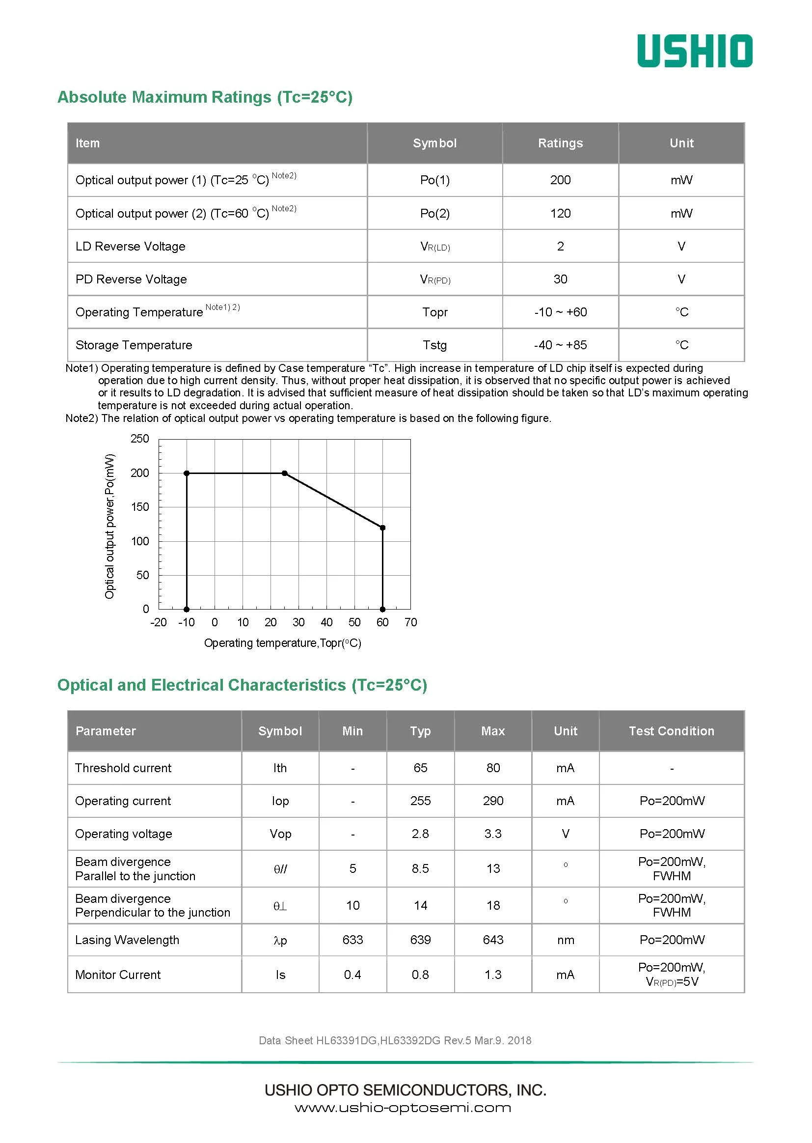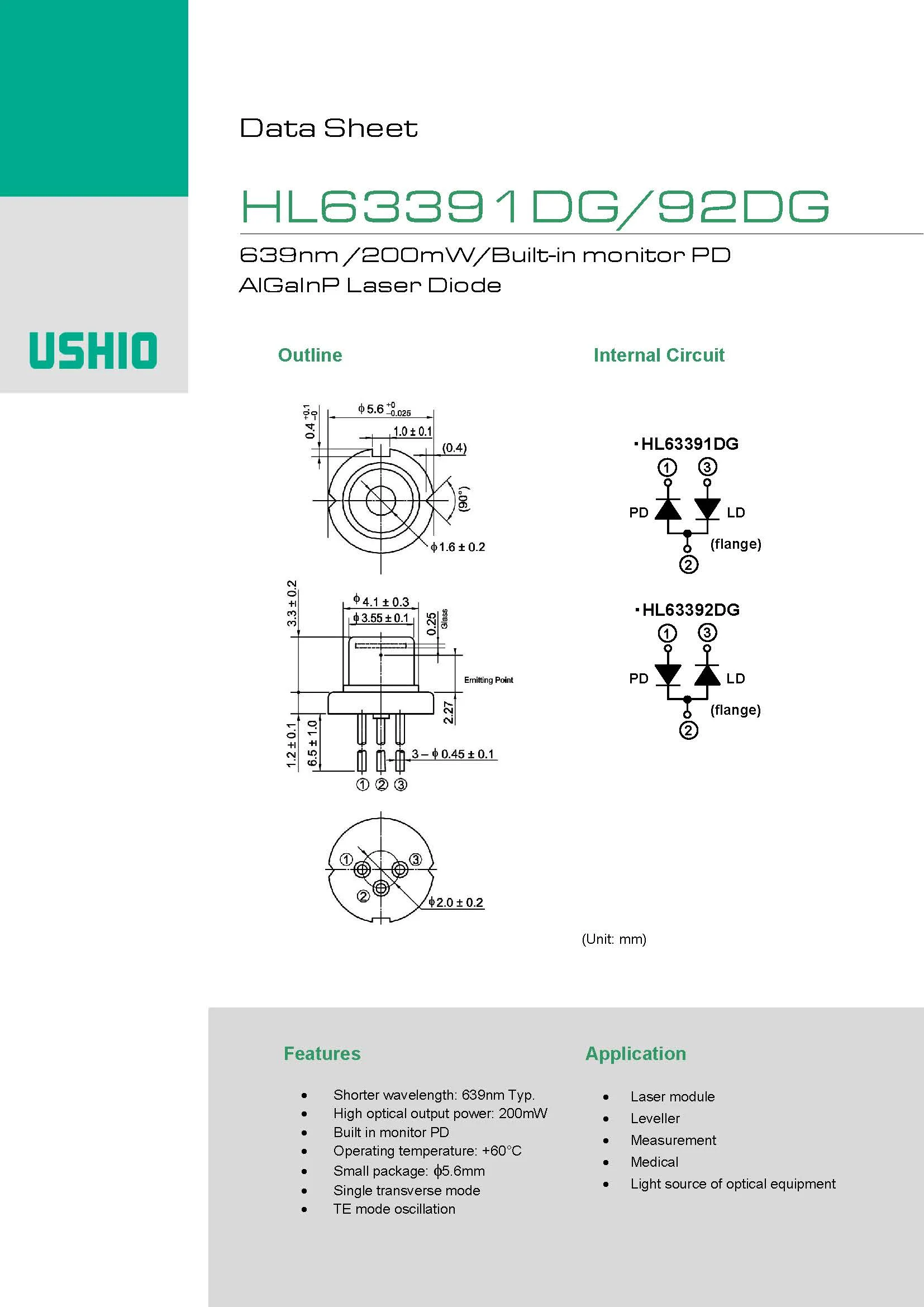 Лазерный диод USHIO HL63392DG 200 мм, красный, нм, нм, МВт (одномодовый)