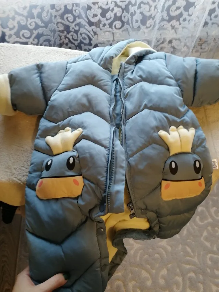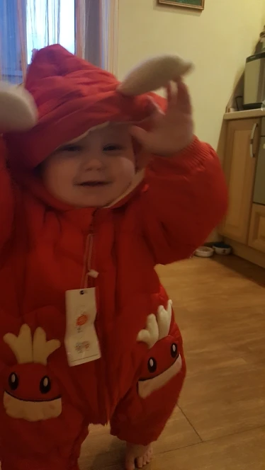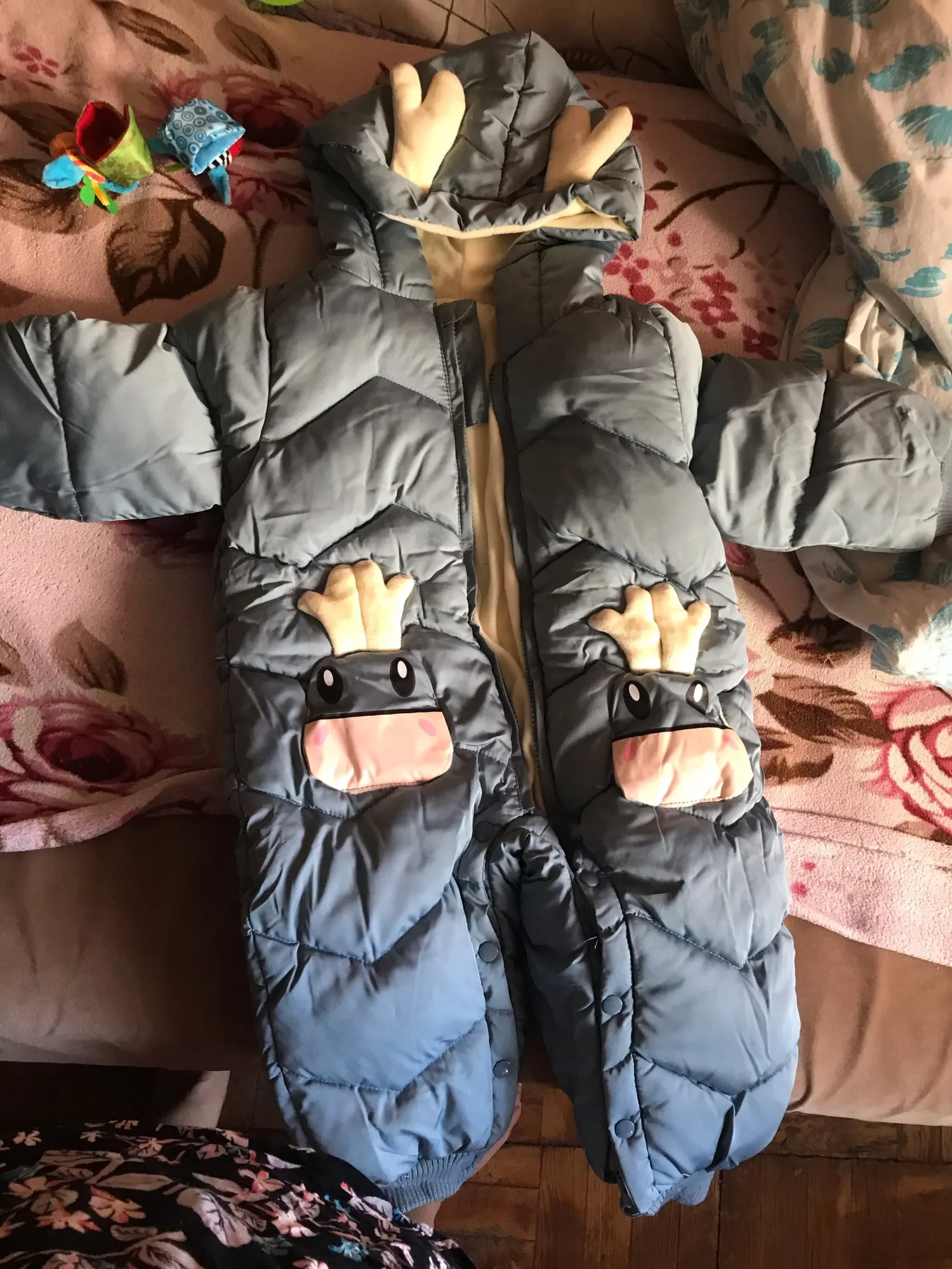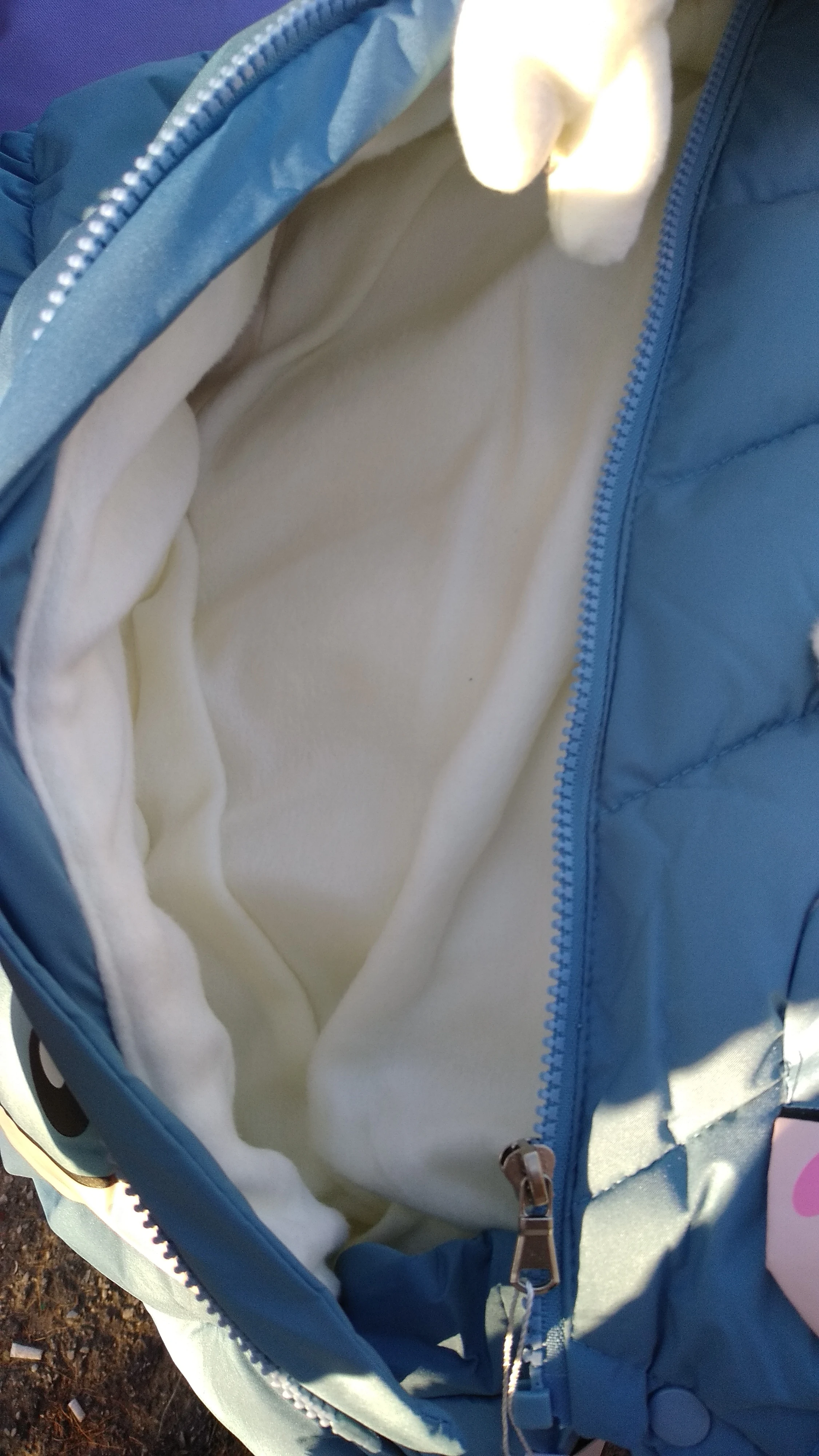 Симпатичный комбез. Сшит хорошо, ниток не торчит. Стирку пережил на отлично. Утеплитель не свалялся, товарный вид сохранен. Подкладка синтетика, но очень мягкая и приятная на ощупь цвета топленого молока. Цвета яркие. Размер взяла 9М, это для ребёнка примерно 80 см ростом. Нам оказался сильно велик, поэтому навырост.