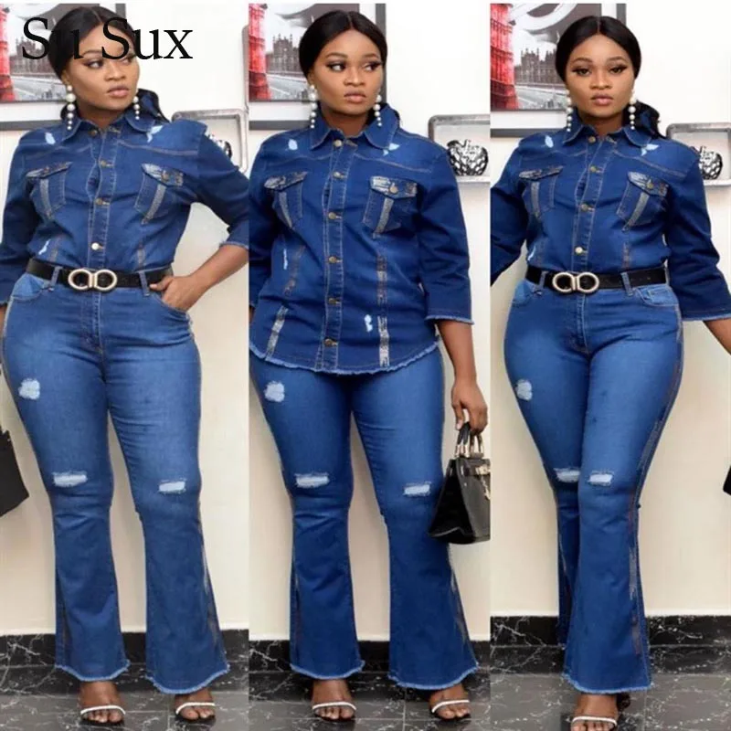Костюм джинсовый женский повседневный, комплект из двух предметов, топ с рукавом до локтя и расклешенные брюки, осень 2020
