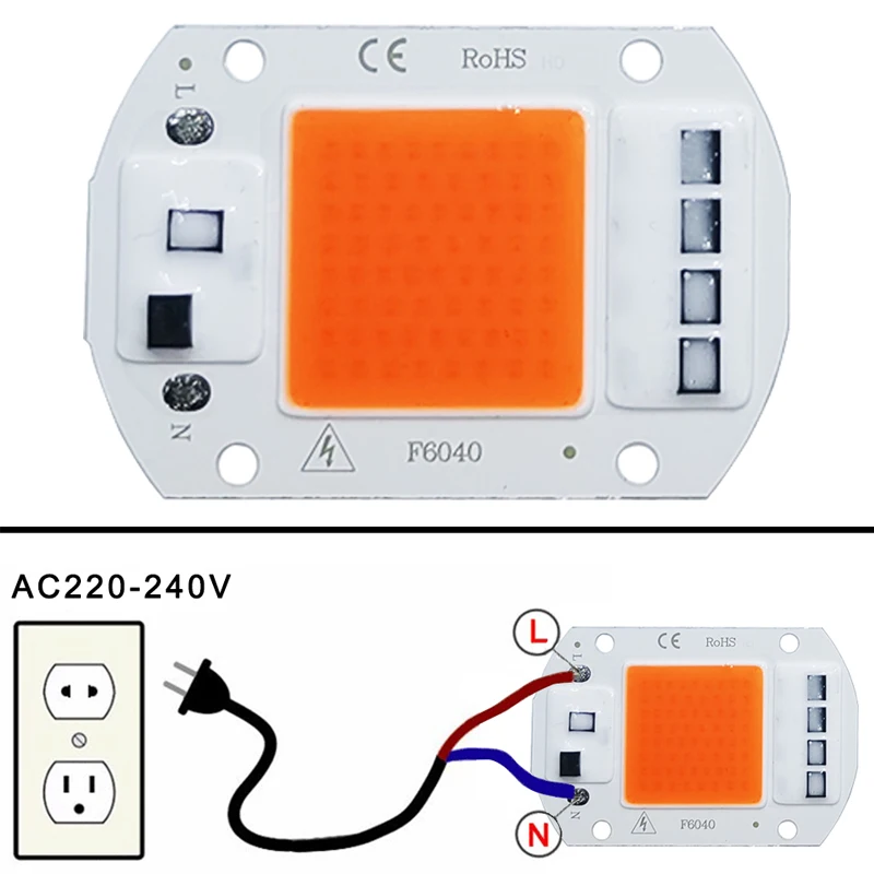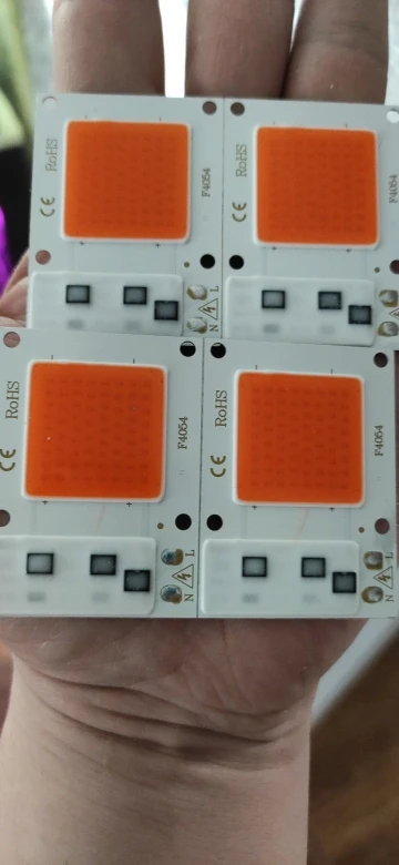 Продавец отправил товар сразу, через две недели получил, за это ему моя благодарность. В России пакет не отслеживался. Выглядит не очень, поверхность липкая, на подложке заусенцы по краям и в отверстиях, пришлось обработать. На чипе маркировка 6040 A2 это как я понимаю формфактор и вид спектра, мощность не указана. Центры отверстий в углах квадрата 34 мм, во всяком случае для 6040. Поставил в старую алюминиевую сковороду с толстым дном на термопасту, накрыл штатной стеклянной крышкой, включил соблюдая полярность N; L, работает и практически не греется. Есть ли там 50 ватт или нет проверять не досуг, а вот свет для человека очень тяжёлый, очень. Пока освещать нечего, рассады ещё нет. Когда по настоящему поработает, если будет негатив, отпишусь.