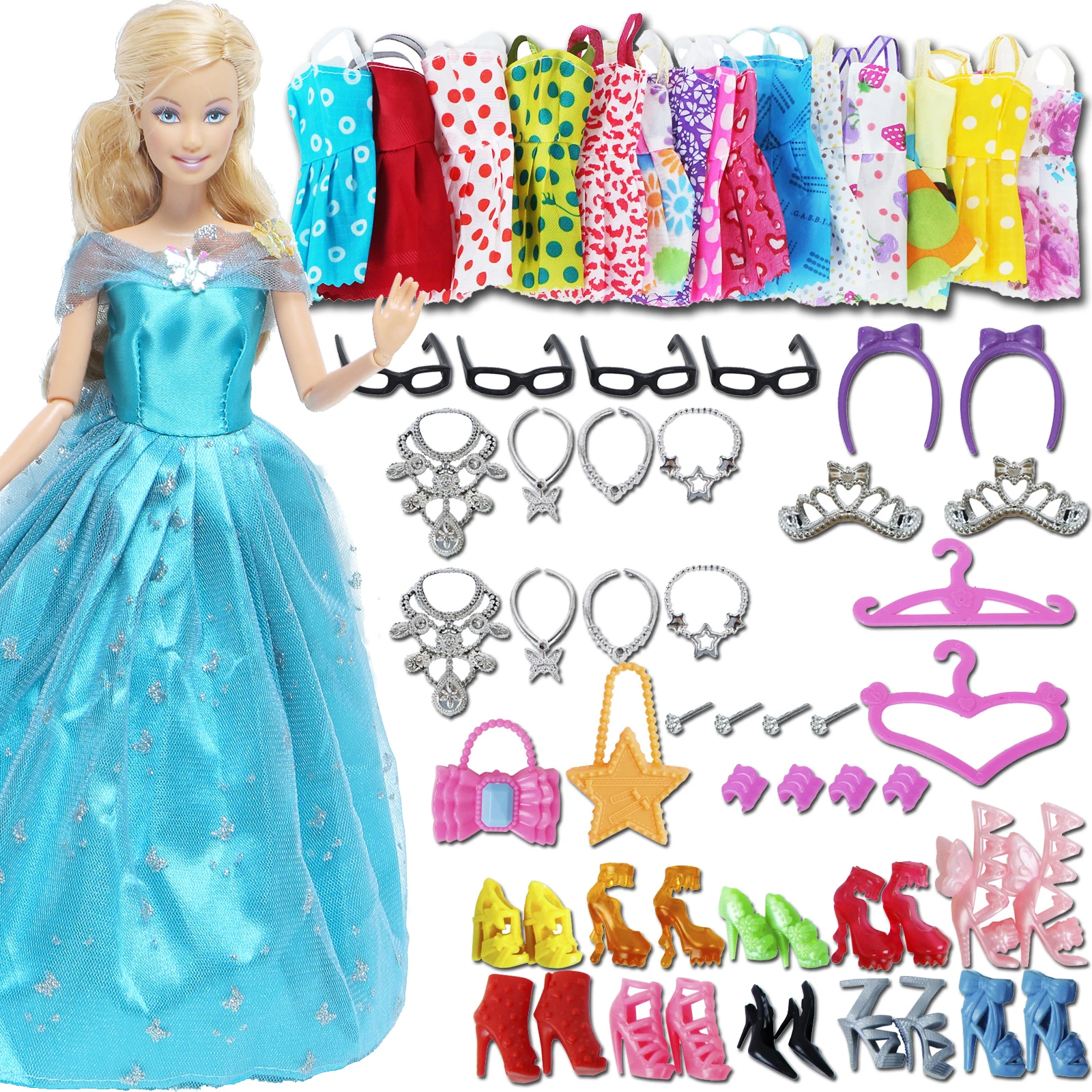 Package (1 )Random 10x Shoes + 8 Necklace 4 Glasses 2 Crowns 2 Handbags + 8x Dress