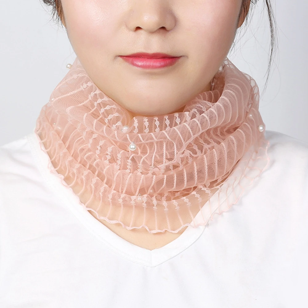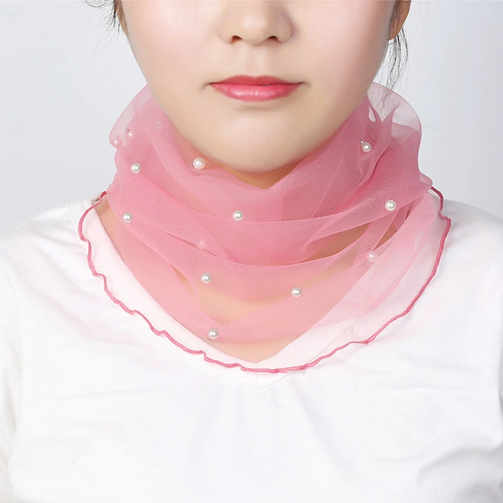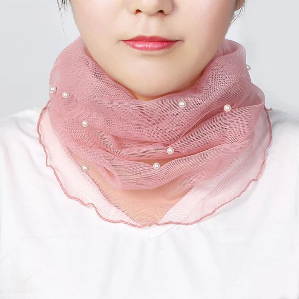 Женский шифоновый сетчатый шарф HanXi, мягкая эластичная повязка на голову с жемчугом, с искусственным воротником