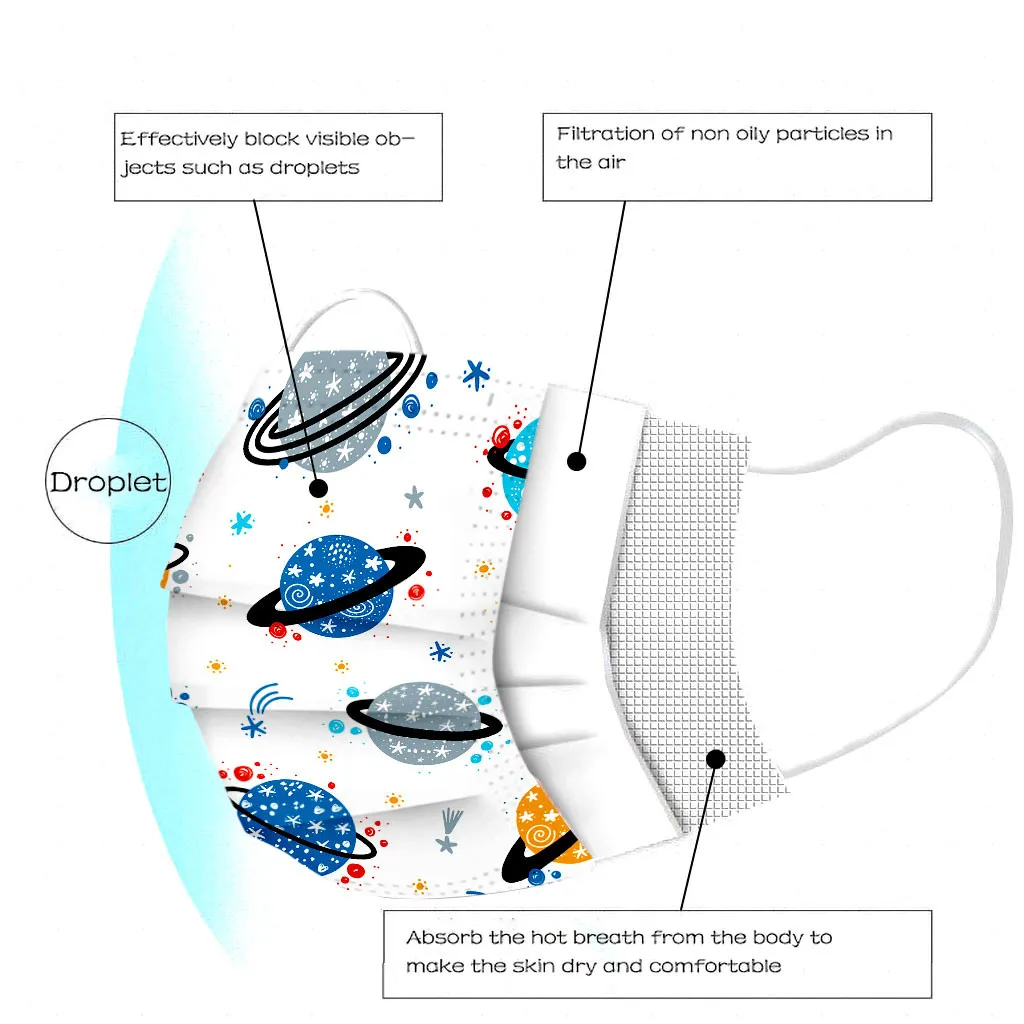 В 3 слоя Нетканая одноразовая маска изготовлена из 3 слоев нетканого материала, Безопасен и безопасен для использования. Дышащий материал и милый Узоры, которые делают его полезным и модным. Специальный 3 слоя из нетканого материала Дизайн, обеспечивает некоторую защиту от пыли, автомобильных выхлопных газов, Пыльца и т. д. эластичная Ушная петля, легко носить и не давит на уши. Маникюрный салон или любые другие области, где может потребоваться защита