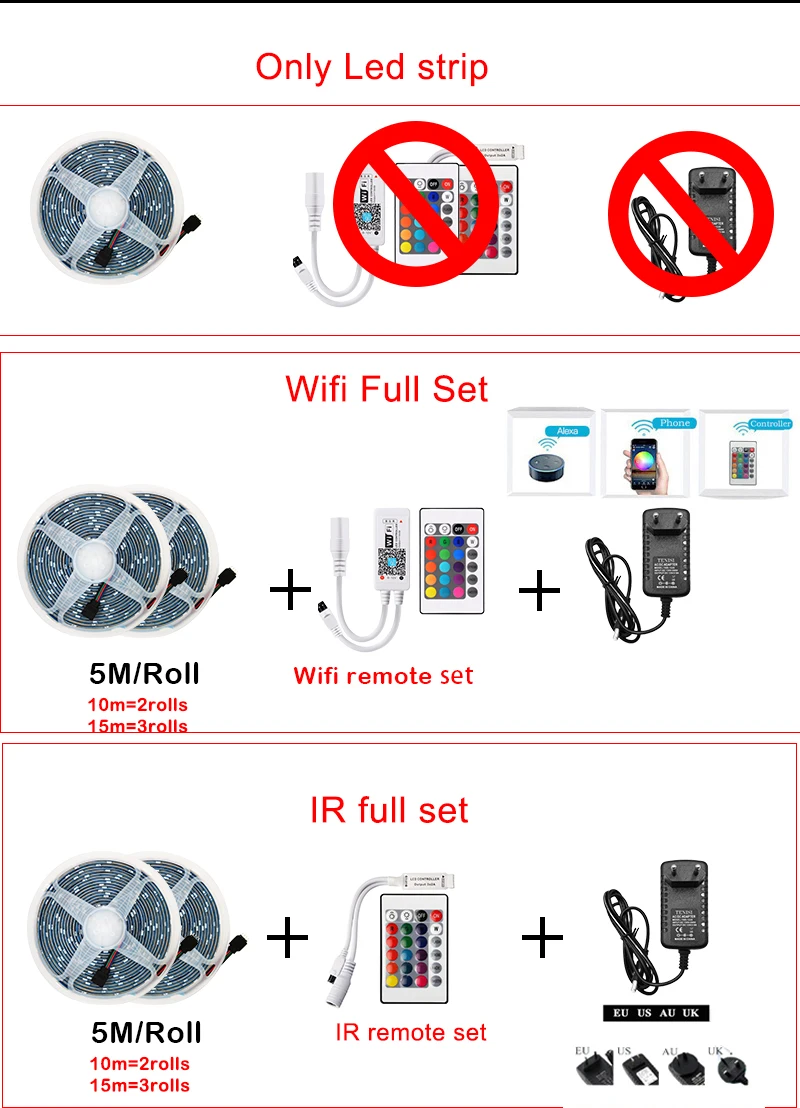 Страна: NL Emitting Color: SMD 5050 RGB 60leds Color: Non Waterproof IP20 Wattage: 15M Length: Wifi Controller Set Доставка: Standard Shipping 17.03.2021