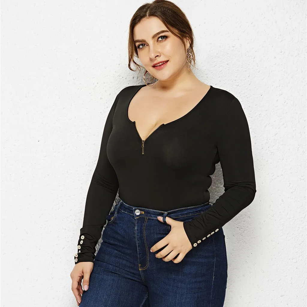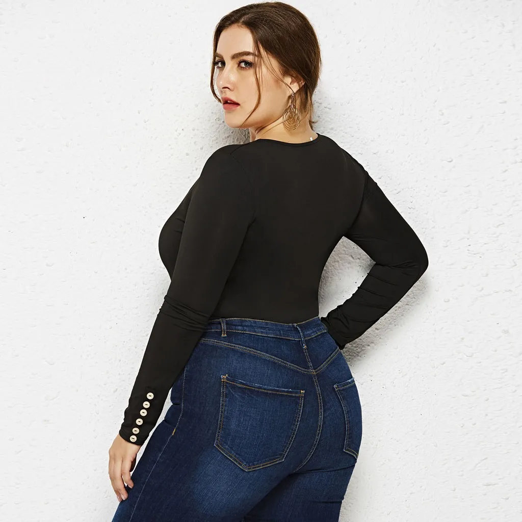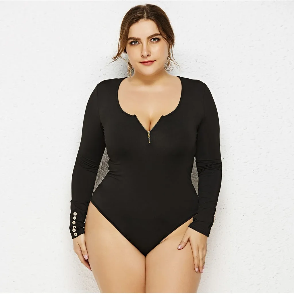 Боди женское хлопковое, черное, большого размера, с пуговицами и молниями, боди с длинным рукавом