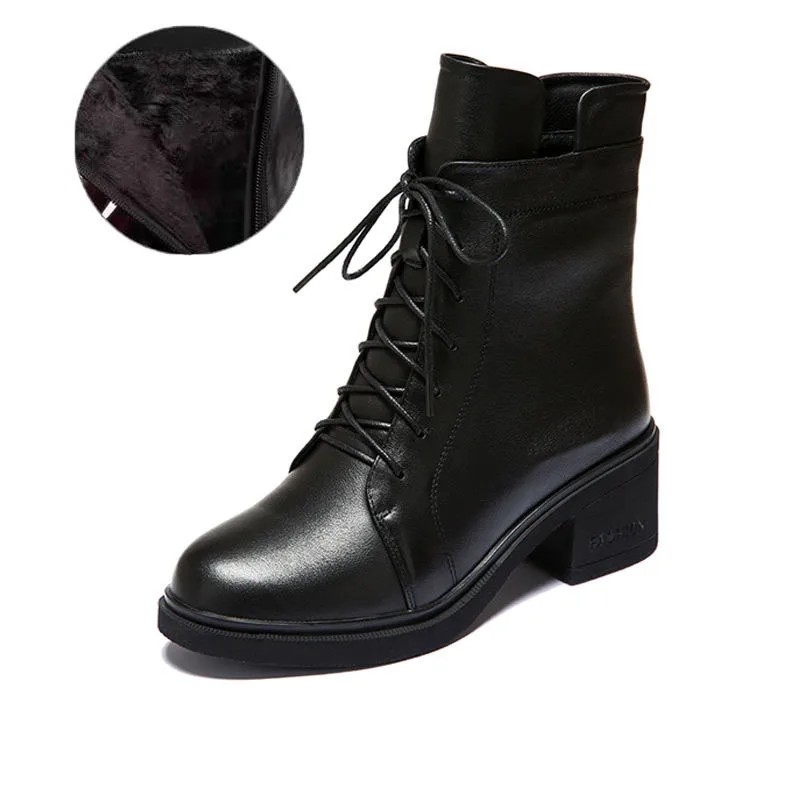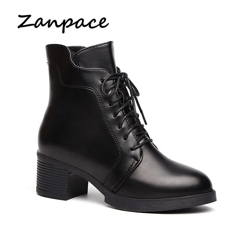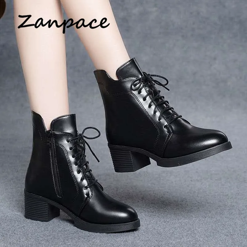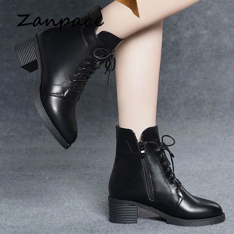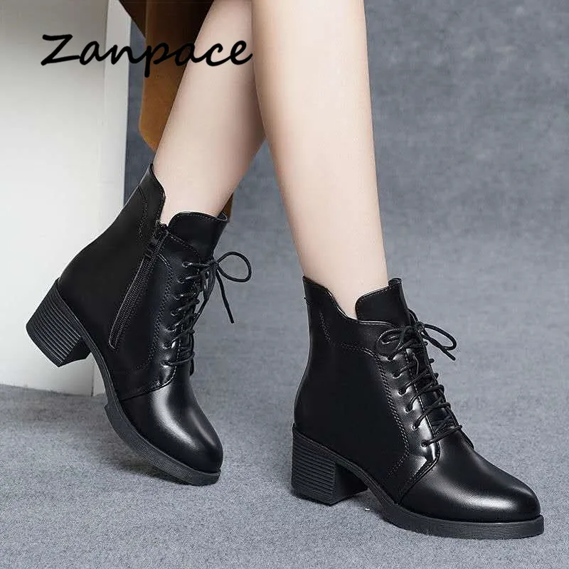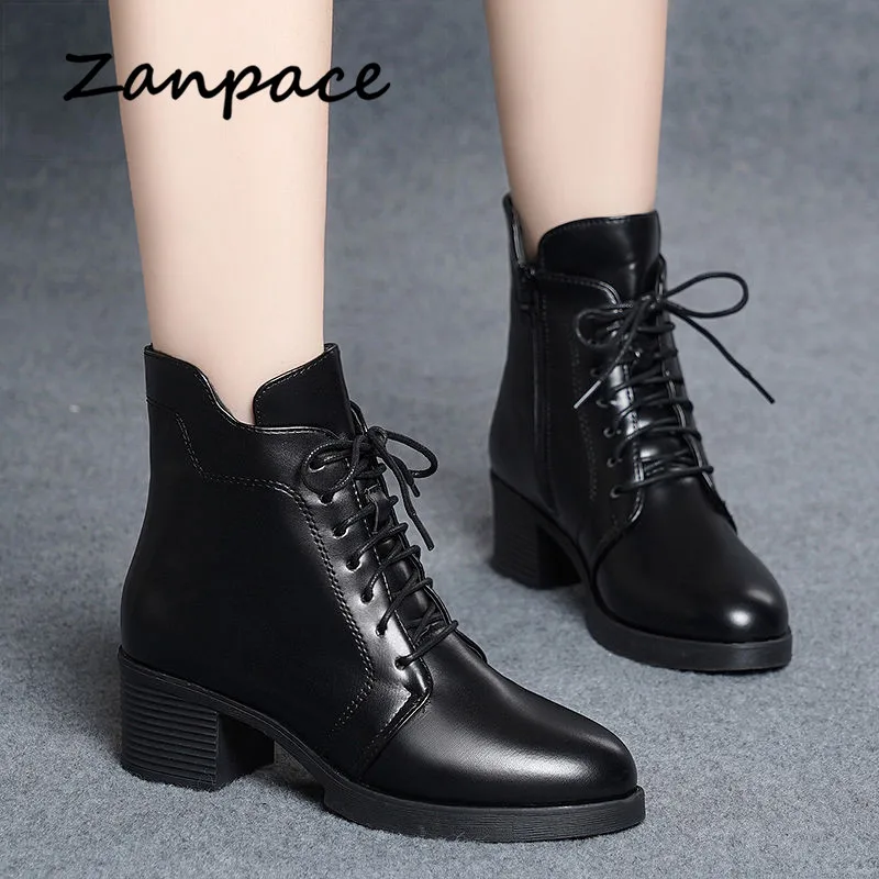 Новинка 2021, зимние сапоги ZANPACE, женские теплые осенние сапоги на меху со шнуровкой, кожаные женские ботильоны на высоком каблуке с острым носком