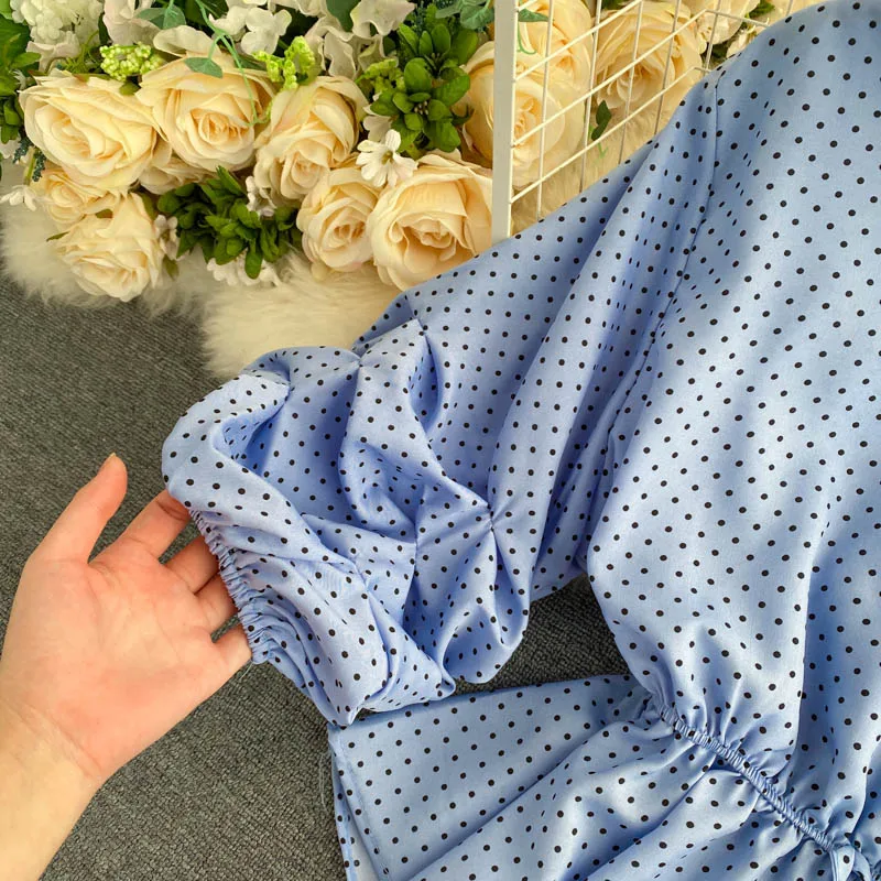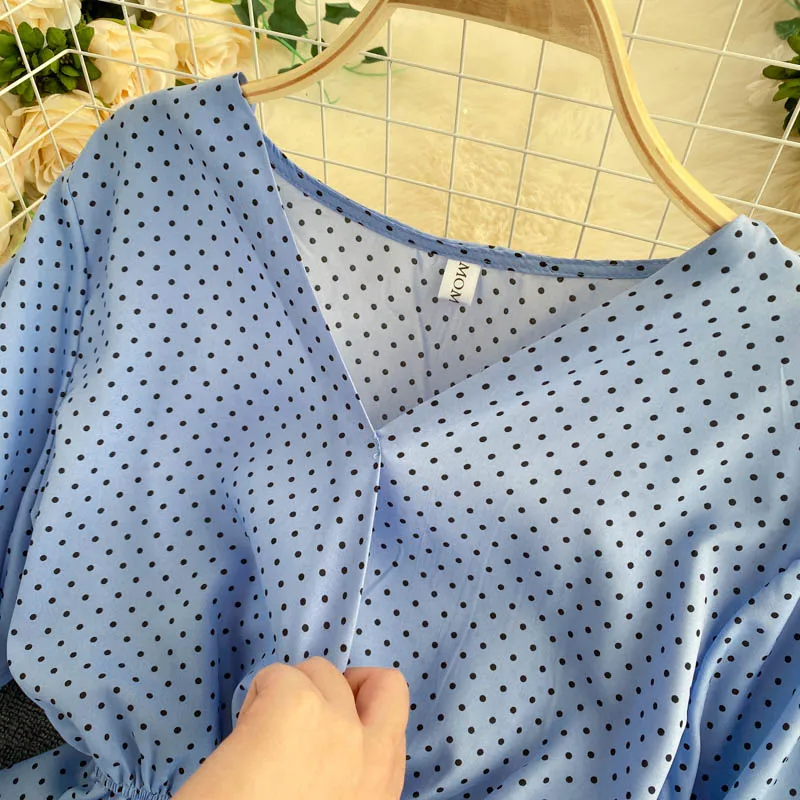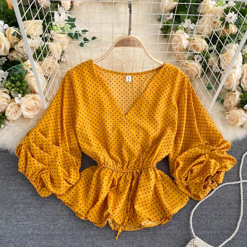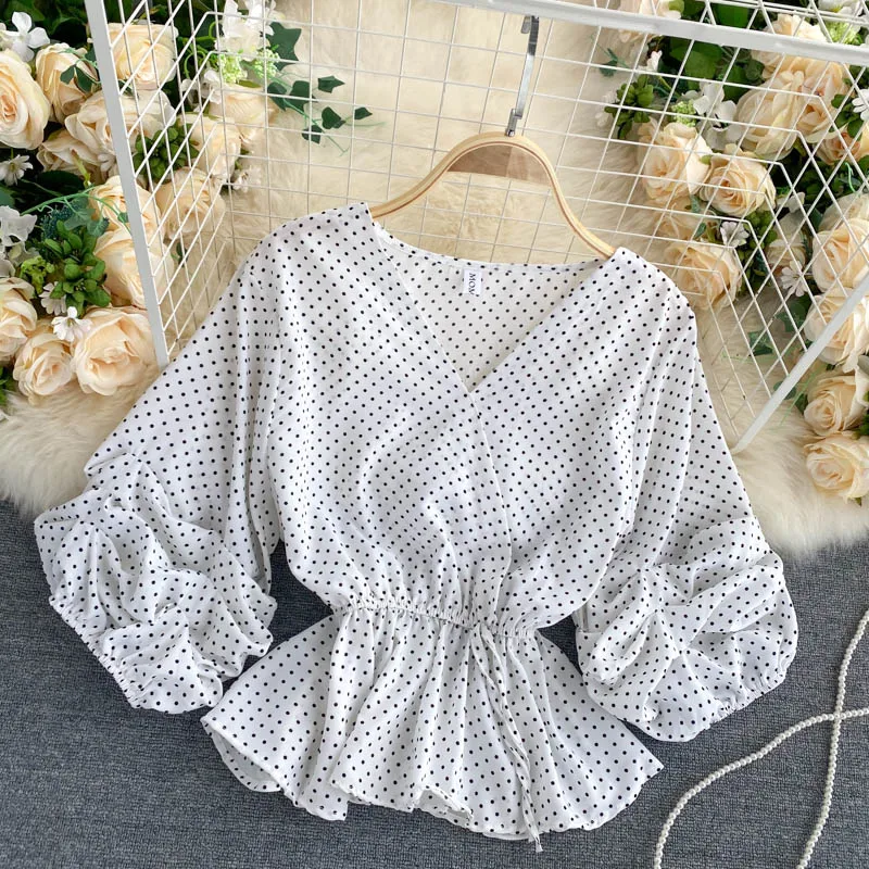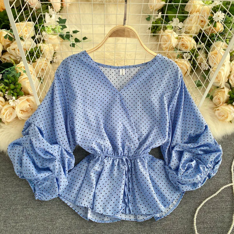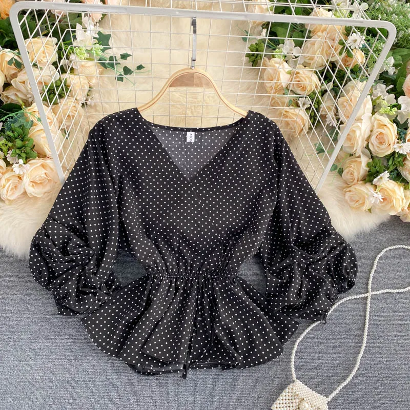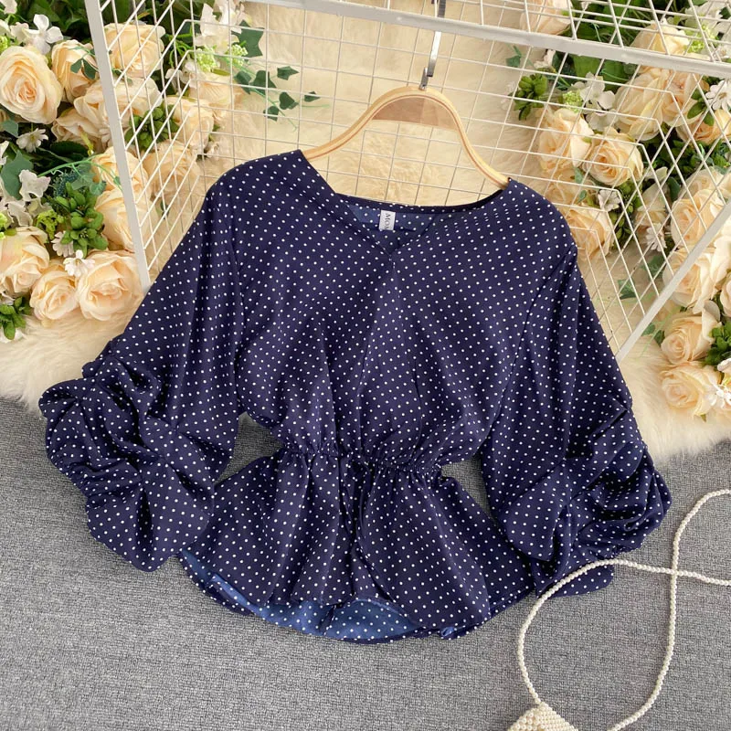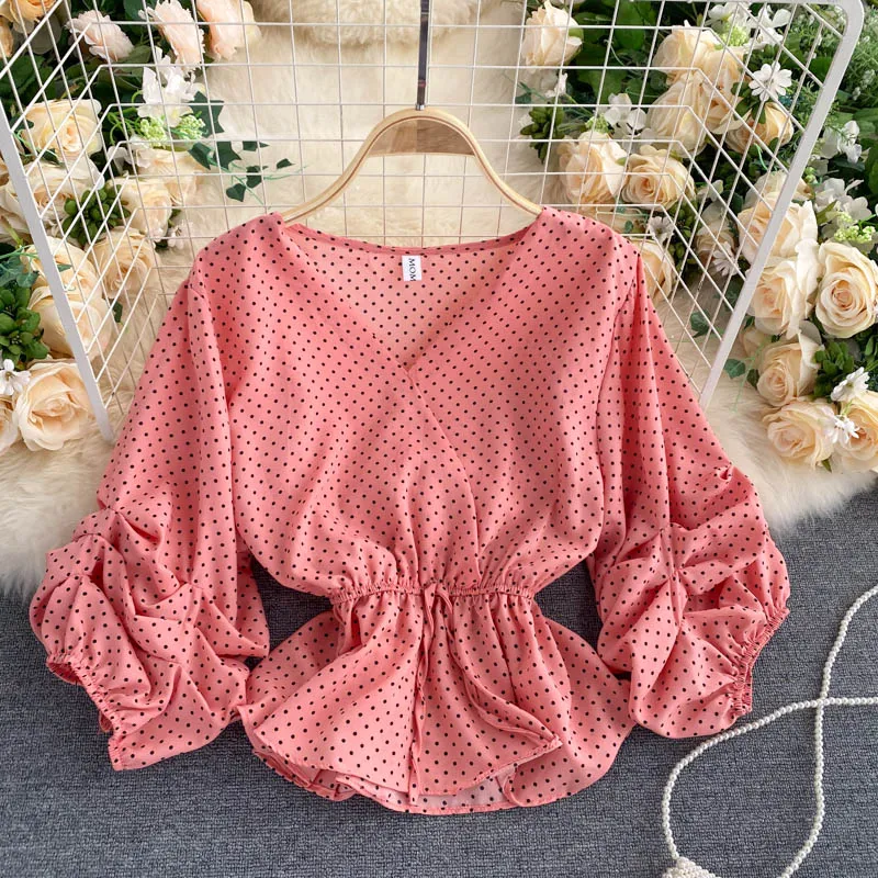Наименование товара: Весна-осень, женские топы, новые ретро топы в горошек с v-образным вырезом и рукавами-фонариками, корейский тонкий и универсальный плиссированный шифоновый топ LL154