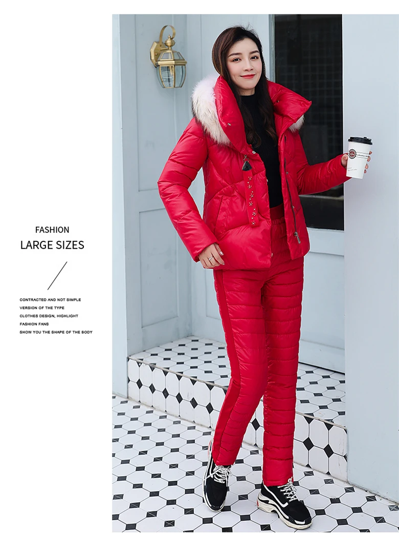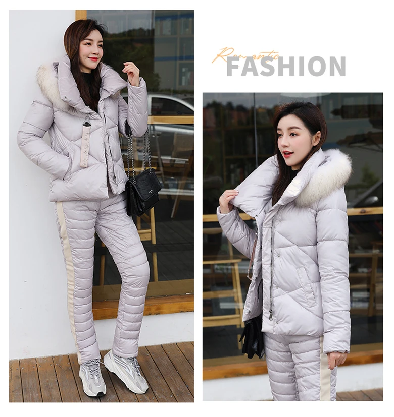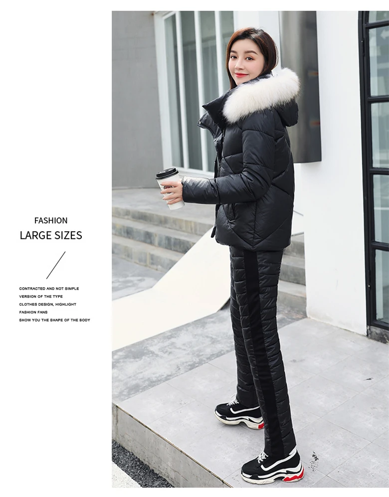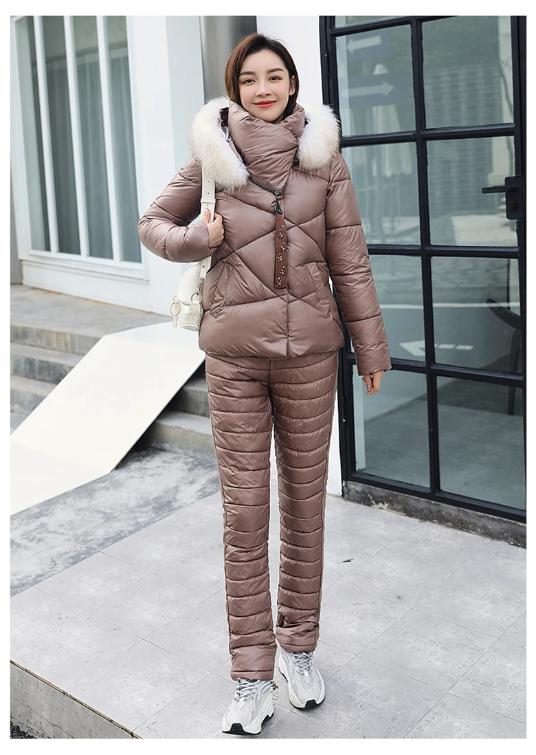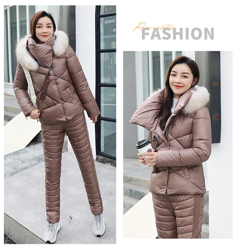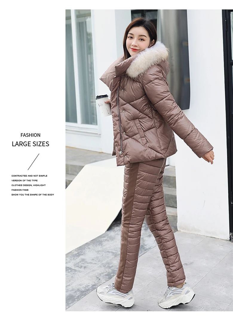 Костюм женский зимний из пуховика и хлопка, с большими лацканами и меховым воротником и карманами