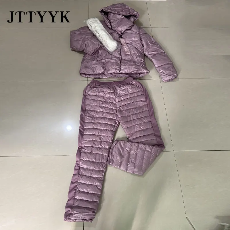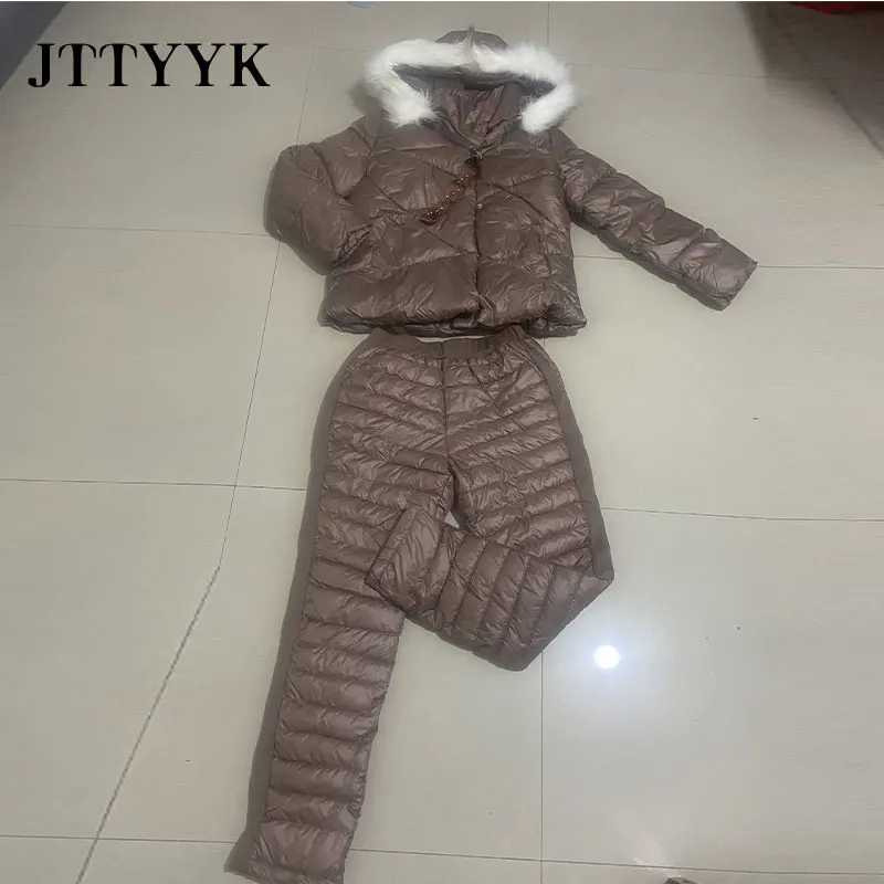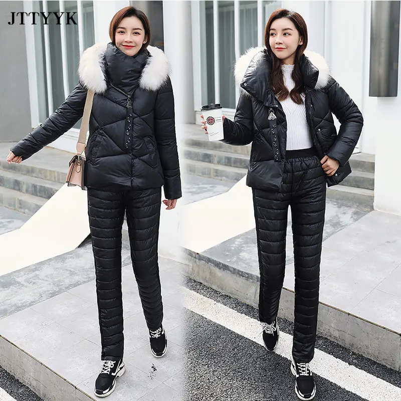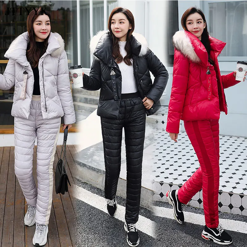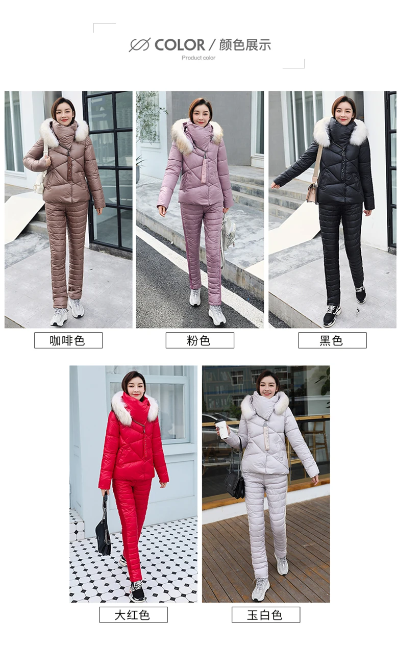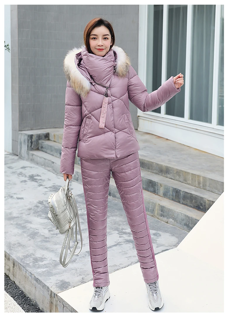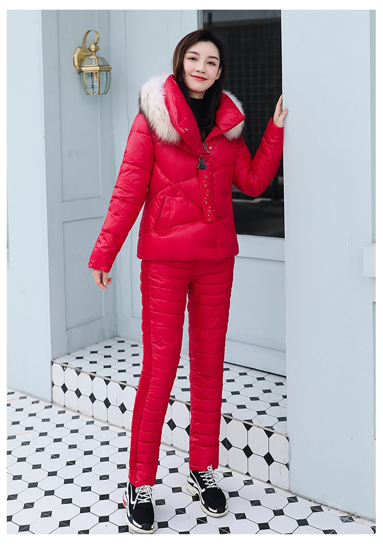 Костюм женский зимний из пуховика и хлопка, с большими лацканами и меховым воротником и карманами