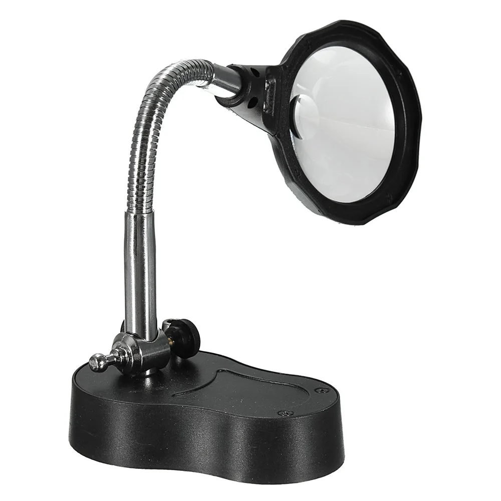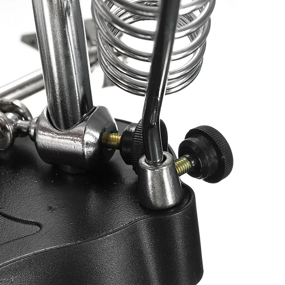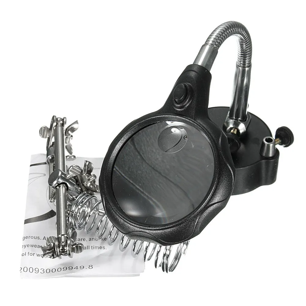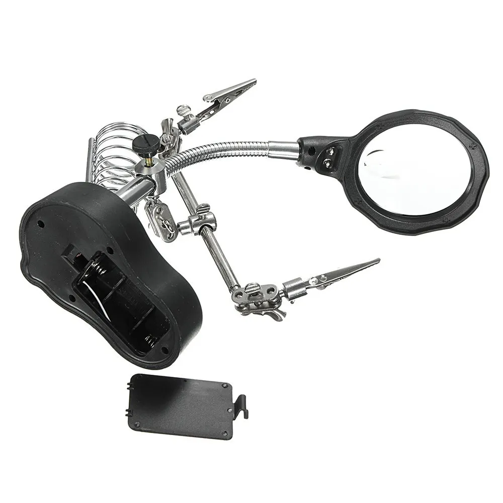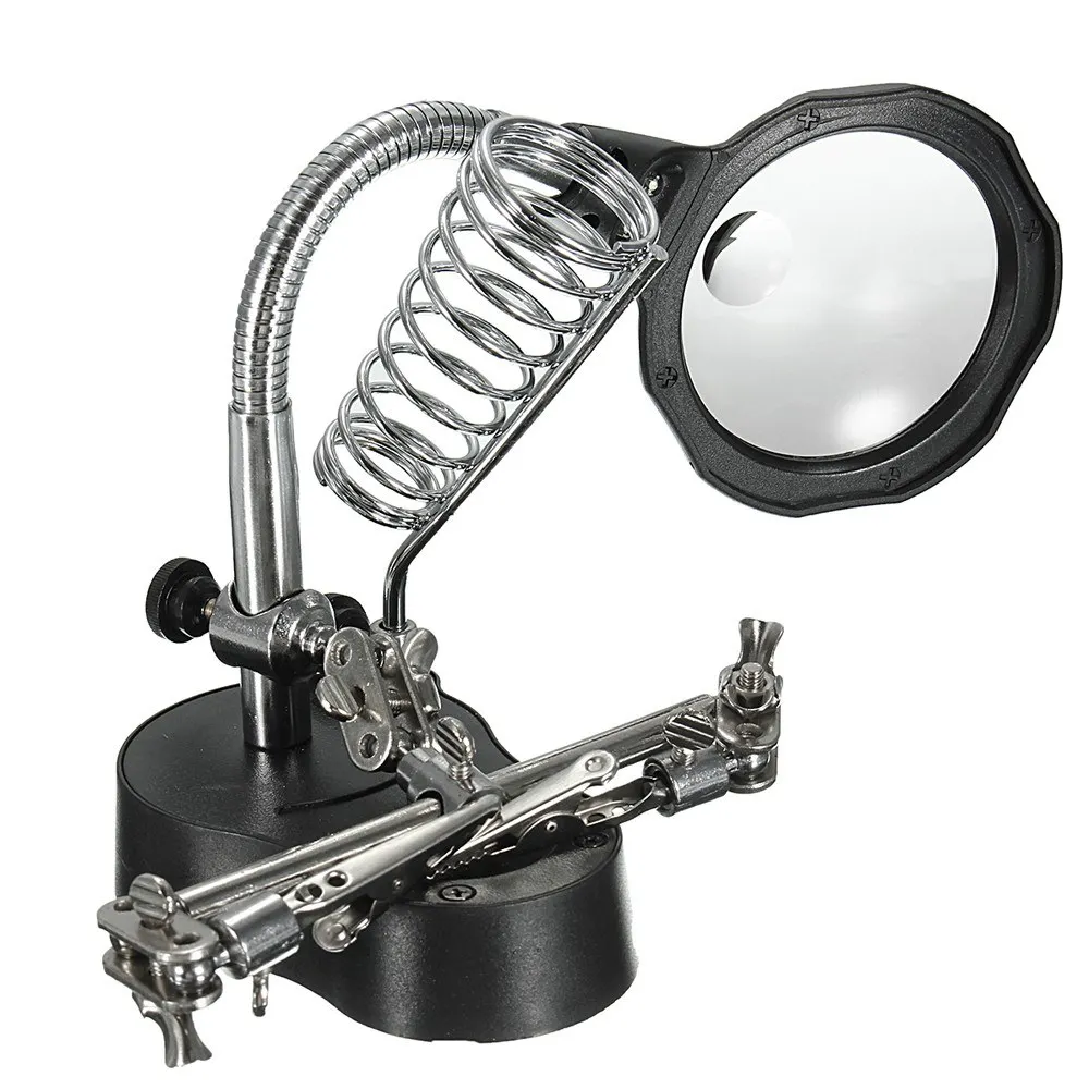 Вот Многофункциональная подставка для паяльника с лупой и светодиодный светильник для удобного и удобного использования.Особенности:Полезная помощь при пайке рабочих мест и проверке.Может также использоваться при изготовлении моделей, производстве ювелирных изделий, ремонте часов и ремесленных работах.С подвижными рукоятками и регулируемыми зажимами для удержания крокодила, позволяющими использовать руки бесплатно.Увеличительное стекло для основного объектива x3.Аксессуар увеличительное стекло несколько X12.Характеристики:Аккумулятор: 3 батарейки AAA (не входят в комплект)Максимальная высота: 150 мм/5,9 дюймаРазмер изделия: 170*160*140 мм/6,69*6,3 * 5.51inВес посылка: 368 г/12,98 унцийРазмер посылка: 130*120*80 мм/5,12*4,72*3,15 дюймовПосылка:1 * Светодиодный паяльник