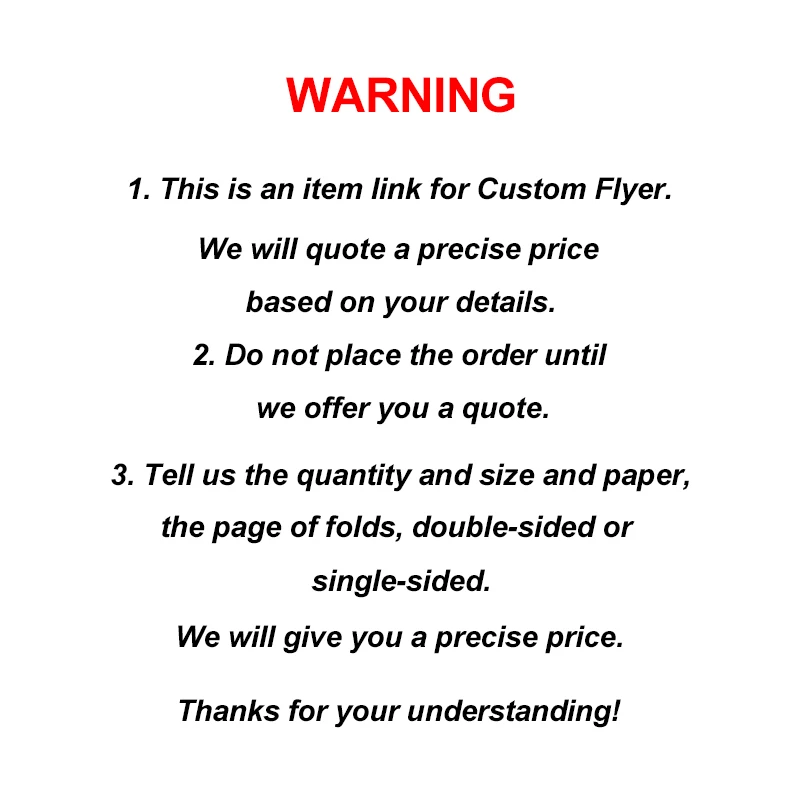 Не размещайте заказ, пока мы не предложим вам предложение. Сообщите нам количество, размер и бумагу, страницу складок, двусторонний или односторонний. Мы дадим вам точную цену.Спасибо за понимание.