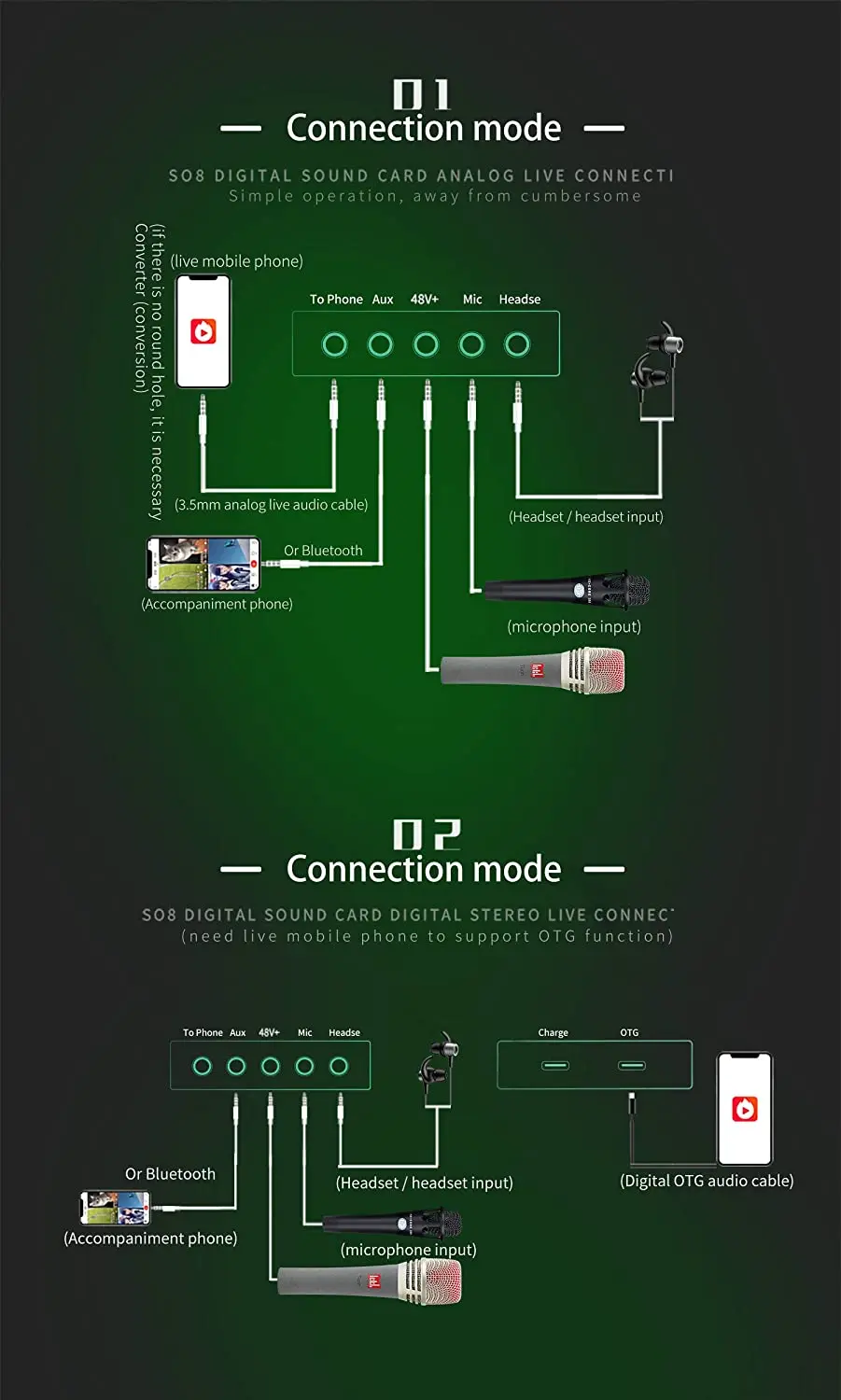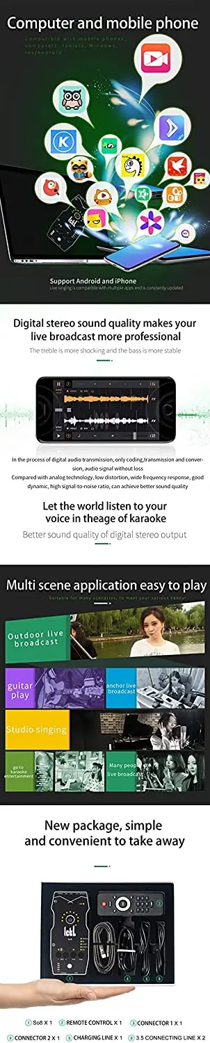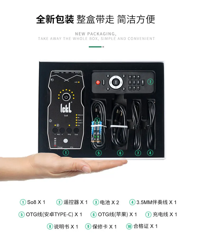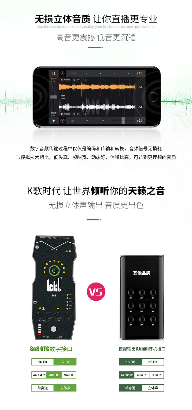 SO8-это караоке-продукт, который поддерживает смартфон и компьютер. Он имеет мощные функции, особенно поддерживает две живые платформы одновременно. Встроенный звуковой чип DSP сделает звук более низким искажением и стерео.