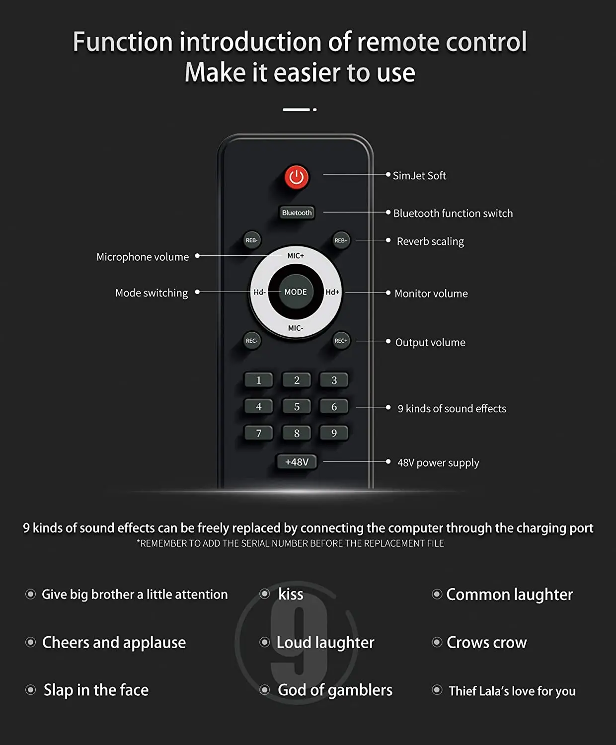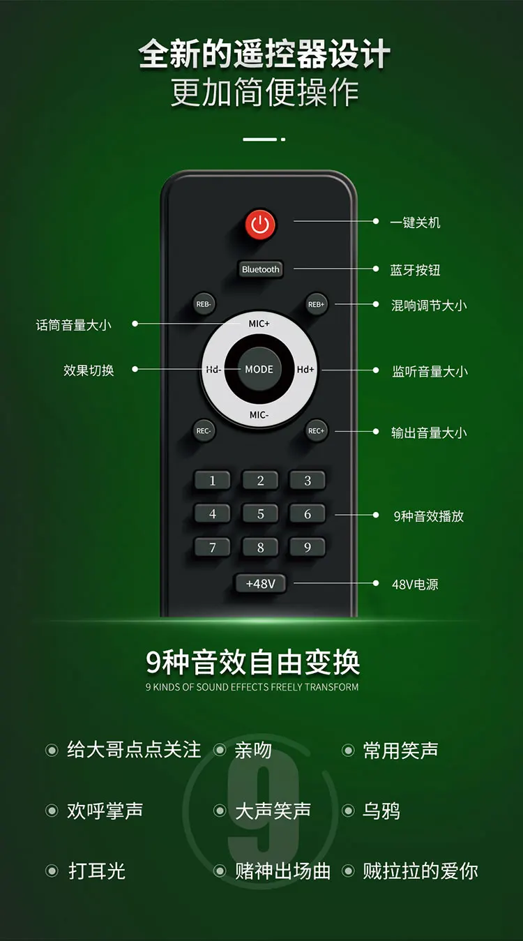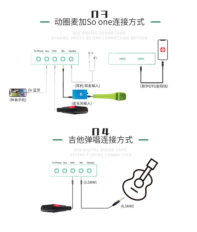 SO8-это караоке-продукт, который поддерживает смартфон и компьютер. Он имеет мощные функции, особенно поддерживает две живые платформы одновременно. Встроенный звуковой чип DSP сделает звук более низким искажением и стерео.