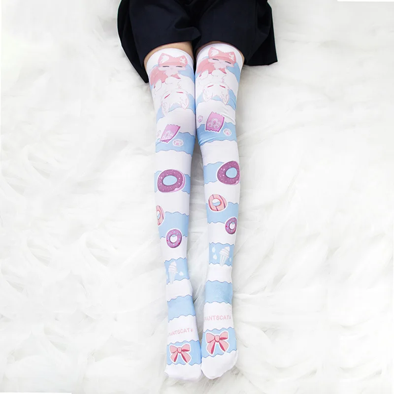 Чулки Kawaii с изображением пончиков лисы с кошачьей лапой Аниме Лолита милые японские чулки до бедра выше колена