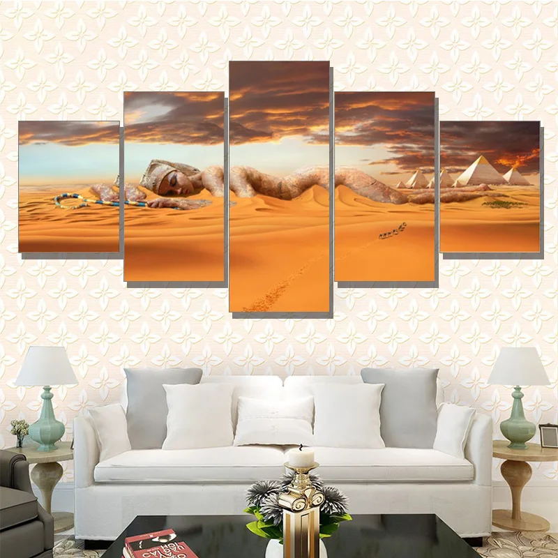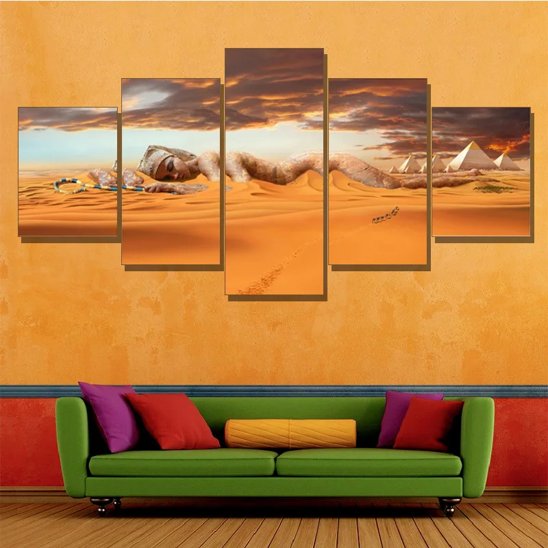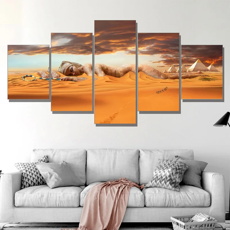 Настенные картины с рамкой для домашнего декора, Постер для гостиной, 5 шт., египетские пирамиды, живопись на холсте, закат, пустыня, богиня, HD печать