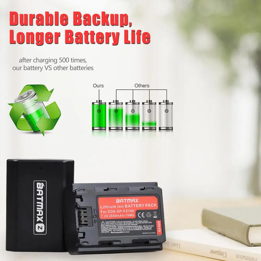 Аккумулятор Batmax 2650 мАч NP-FZ100 FZ100 + новое светодиодное двойное зарядное устройство USB для Sony Alpha 9 A9 9R A9R BC-QZ1,a7c,a7 iii, a7R iii, a9,A6600