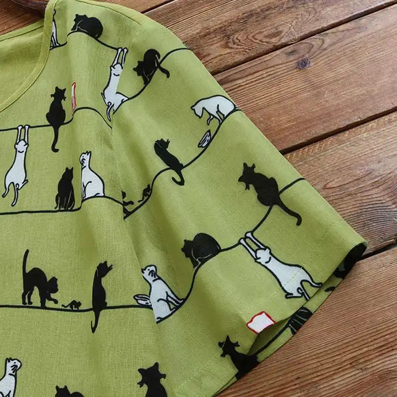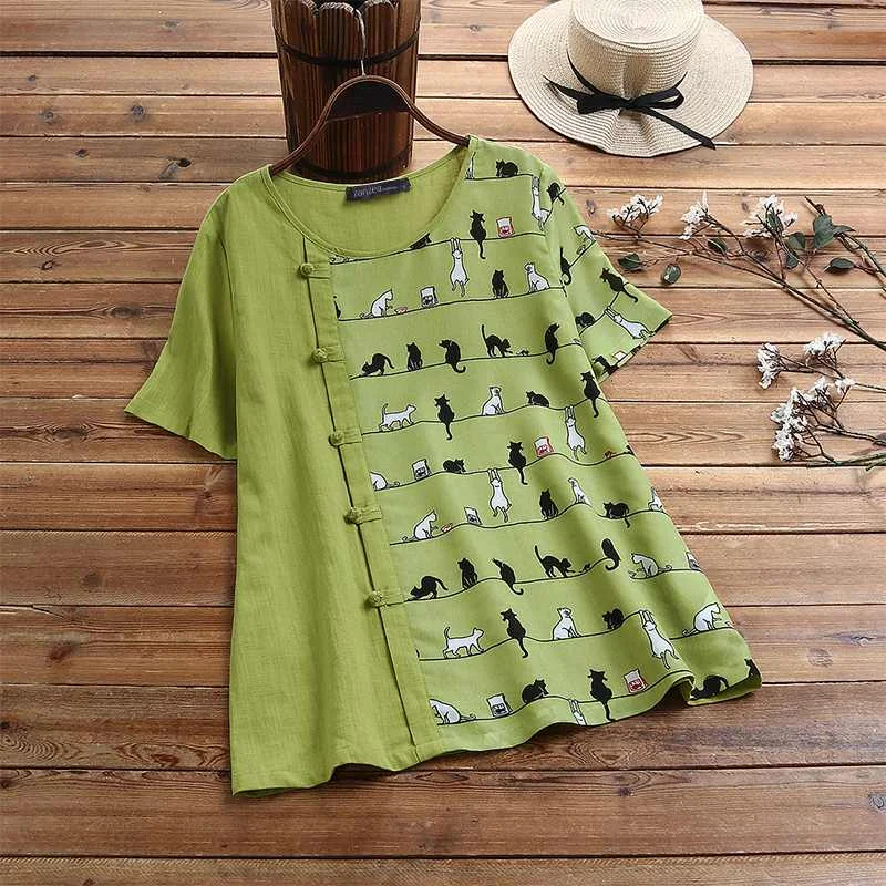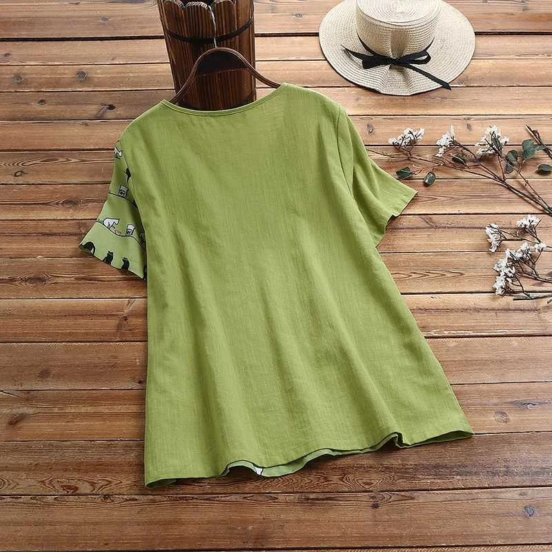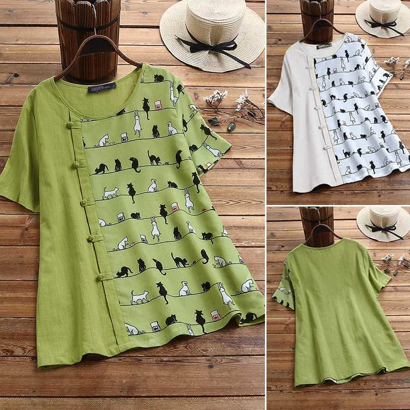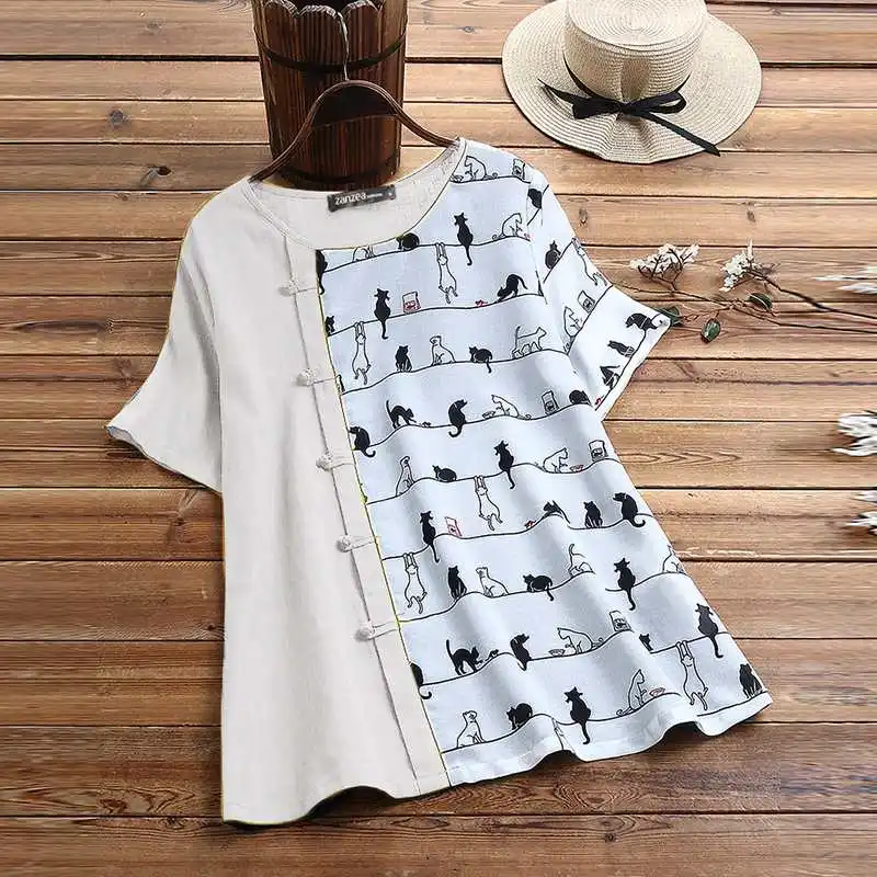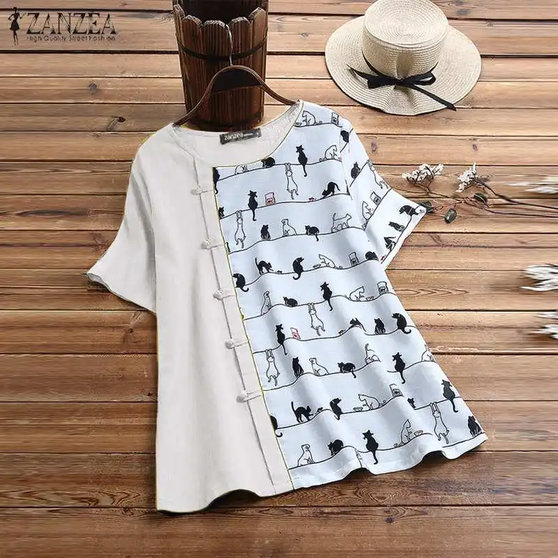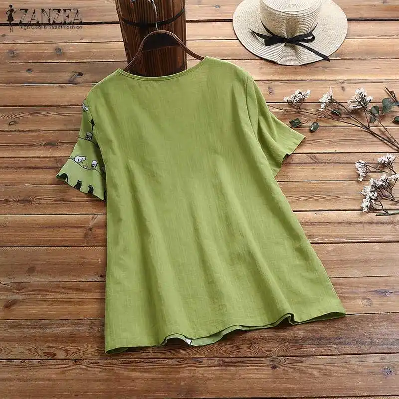 2021 летняя рубашка с короткими рукавами ZANZEA Повседневная хлопковая льняная блузка для женщин с круглым вырезом с принтом Туника Топы Blusas размера плюс 5XL
