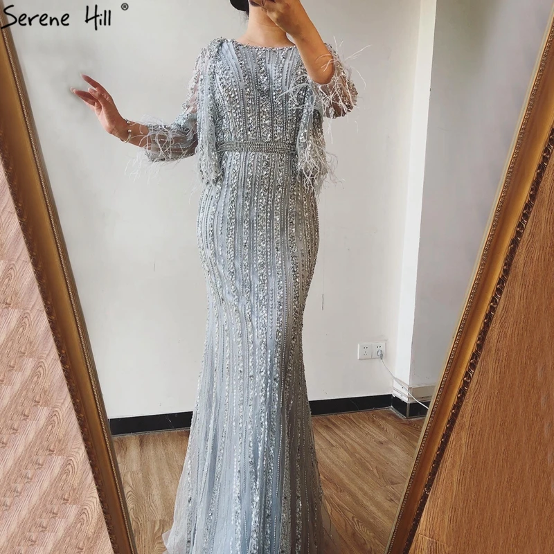 Серое вечернее платье серой русалки Serene Hill с длинными рукавами в Дубае, роскошное вечернее платье с круглым вырезом и стразами, праздничная одежда, платье 2020 CLA70503