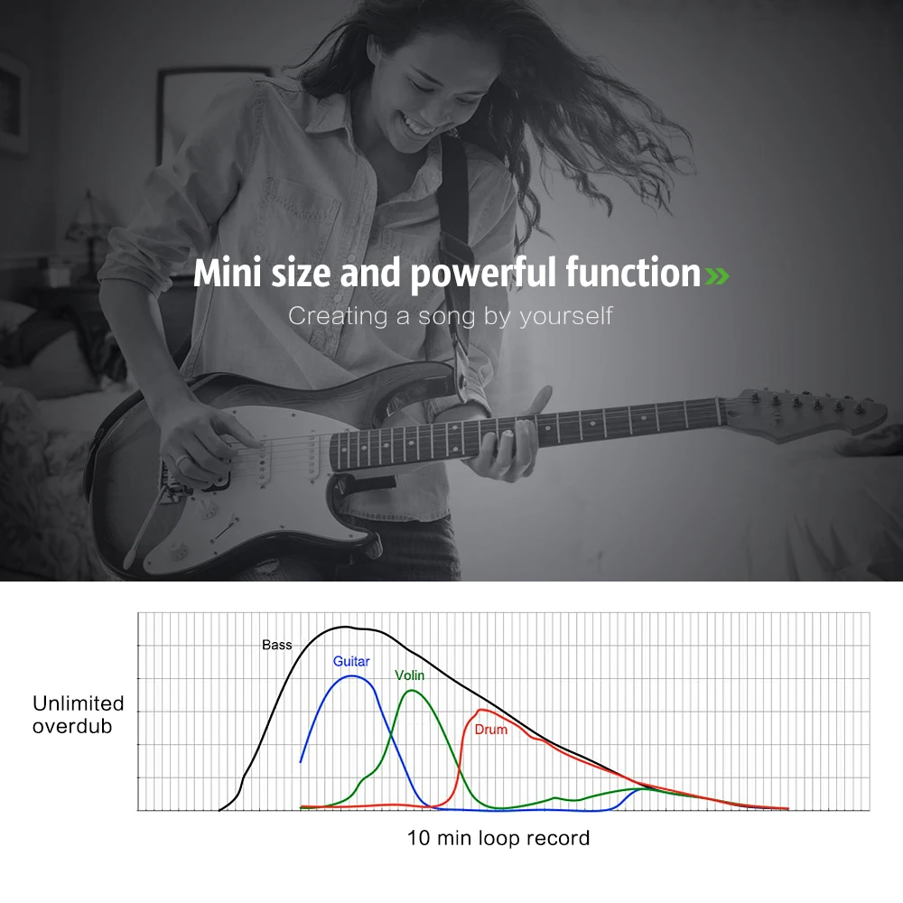 С записью (до 10 мин), overdub (неограниченное количество), отменить, переделать и удалить функции.