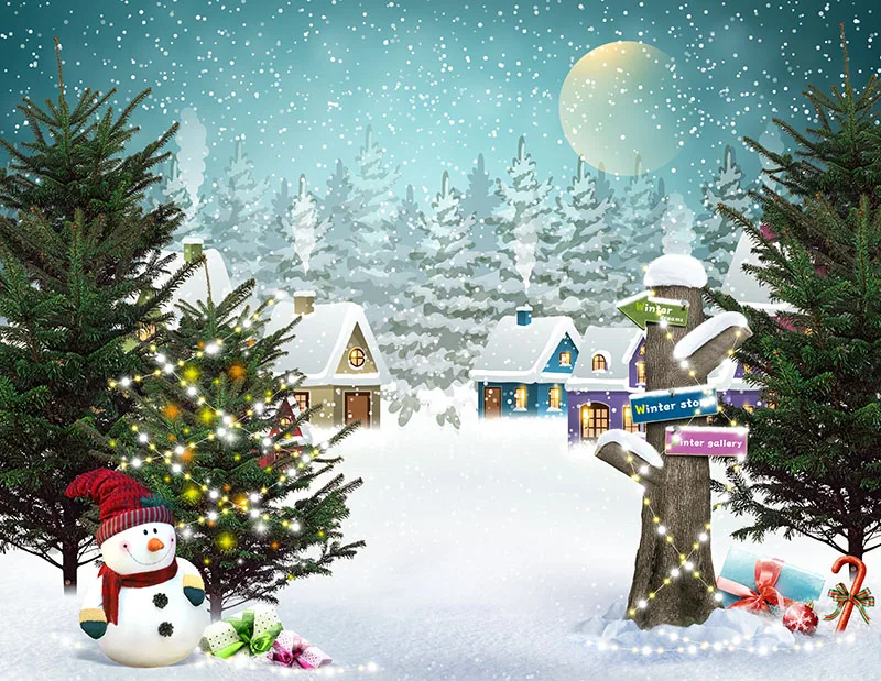 Фон для фотографий Рождественская вечеринка зимнее снежное поле деревья фон снежинка Луна Снеговик день рождения