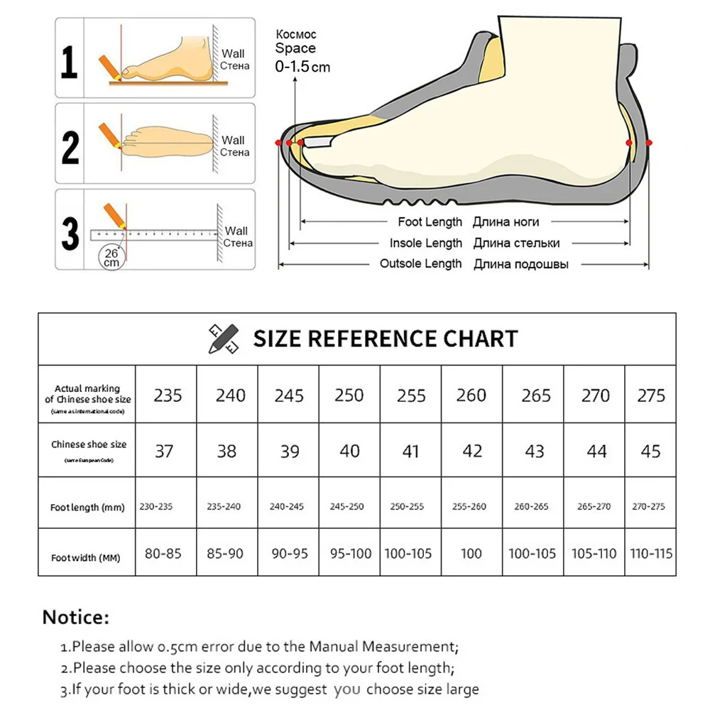 Пожалуйста, внимательно ознакомьтесь с нашей таблицей размеров! Это может помочь вам выбрать правильный размер на основеДлина вашей стопы. Обратите внимание, что если ваша стопа слишком длинная или широкая, пожалуйста, выберите размер на один размер больше обычного.