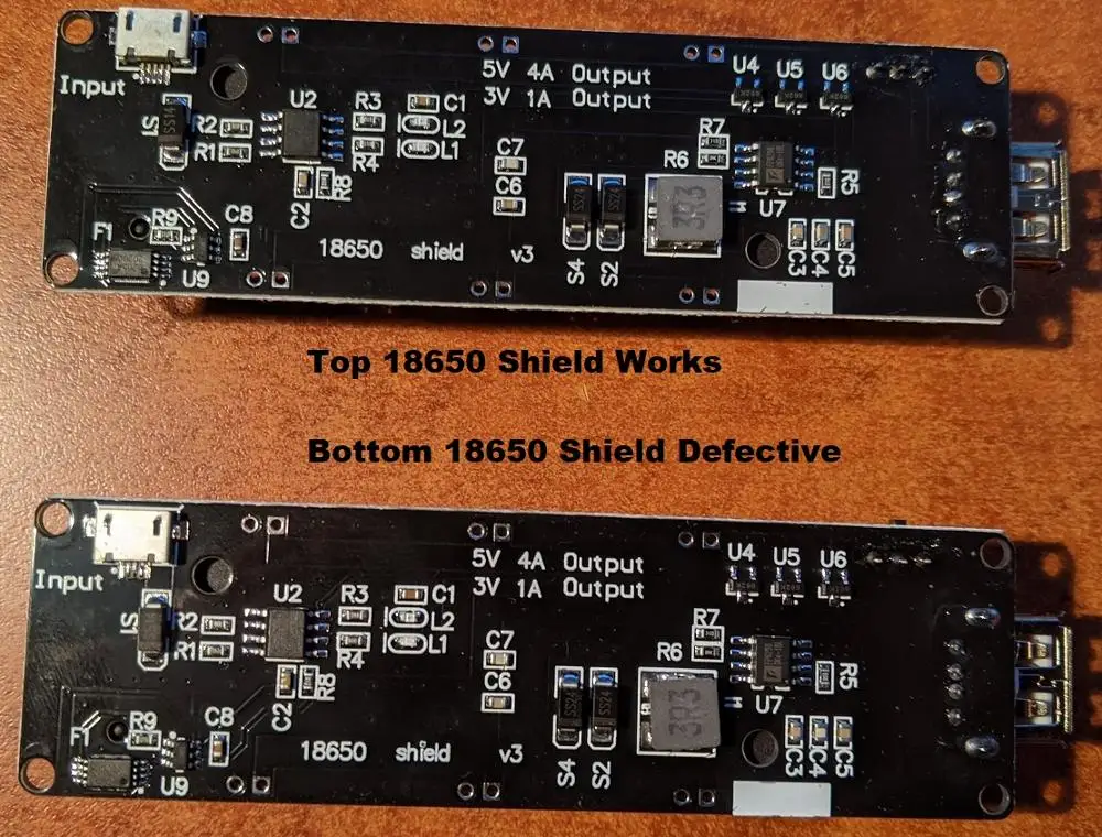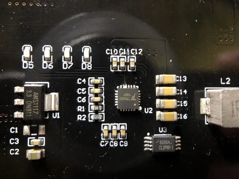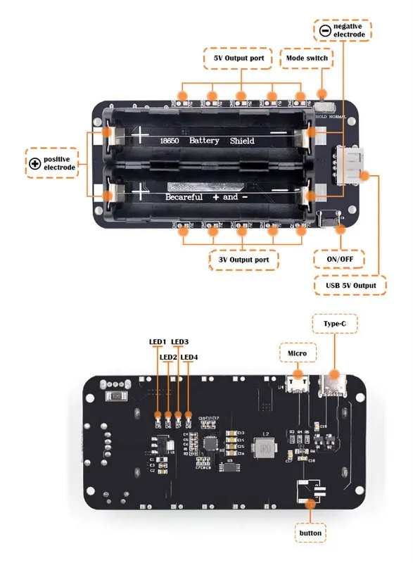В модуле с 2 батареями используется 1117 LDO, в маленькой одноклеточной плате используются 3 гораздо меньших регулятора. Большой, очень хороший, так как переключатель может быть настроен, чтобы оставаться включенным до бесконечности или выключить при отсутствии нагрузки. Также заряжается от micro и Type-C