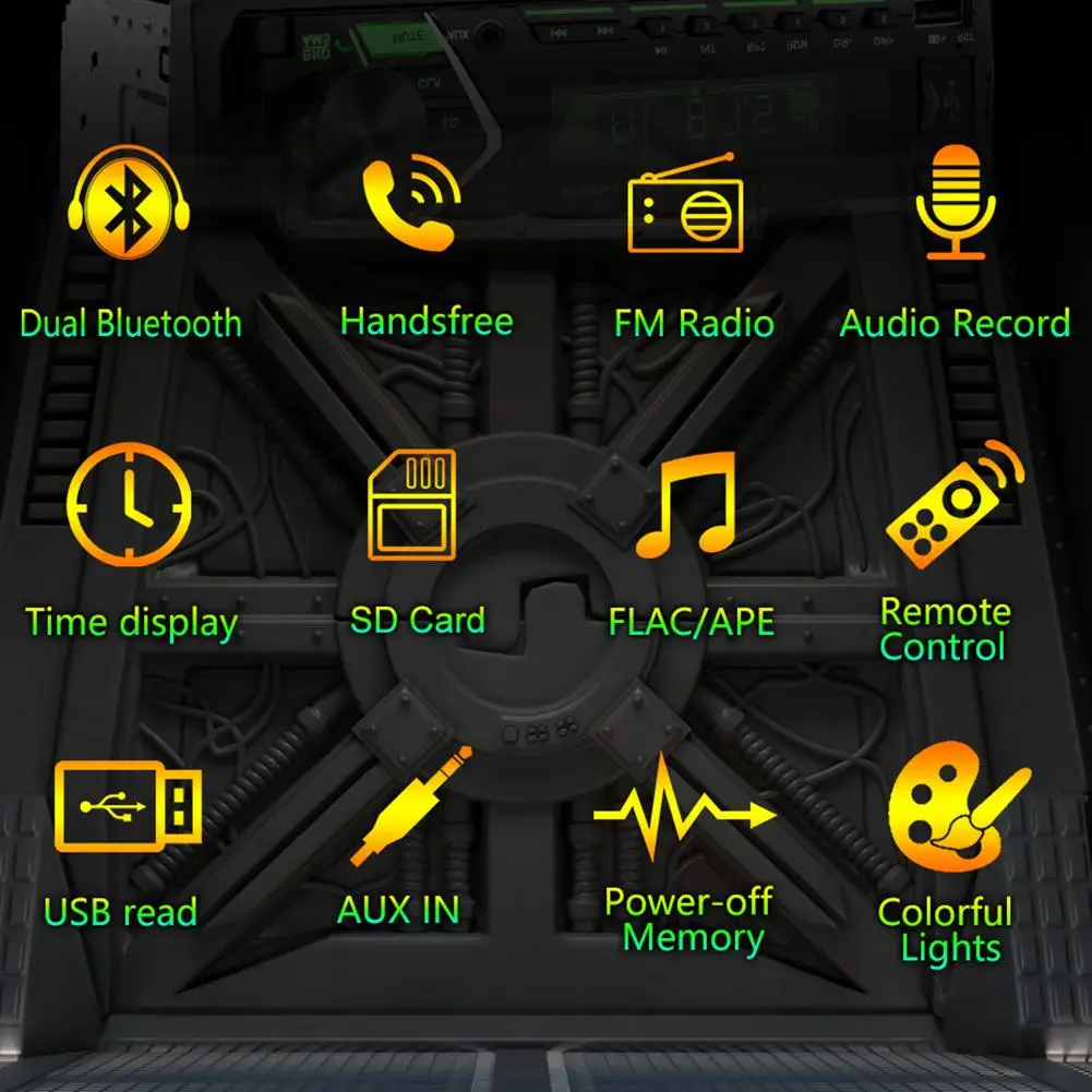 Особенности:1. Bluetooth для воспроизведения музыки Bluetooth для совершения и приема звонков и функции AUX.2. Цифровое высококачественное fm-стерео радио (fm87,5 ~ 108 МГц).3. Поддержка картридера и u-диска (аудио).4. Поддержка аудио: MP3/WMA/WAV/FLAC.5. Аудиовыход RCA может быть подключен к сабвуферу.6. Красочные прохладные огни.7. Функция копирования аудио, поддержка записи источника звука, вы можете Непосредственно копировать радио-и AUX музыку и Bluetooth на U-диск.Характеристики (о):Тип: автомобильный стерео MP3-плеерСпециальная функция: fm-радио, Bluetooth, беспроводные звонки, mp3-плеер, AUX, Двойная зарядка через USB,Модель: 505Напряжение: 12 ВОС: нетПрограммное решение: AB3510Чип усилителя: TDA7389Тип экрана: ЖК-экранРазмер панели: около 188*58 мм/7,40*2,28 дюймаПанельный светильник: Красочный переменный светильникРазмер цветной коробки: около 220*82*181 мм/8,66*3,23*7,13 дюймовХост: материал подошвы: полиуретан толщина около 60 мм/2,36 дюймовВес одной машины: около 418 гРадио диапазон: FM 87,5 ~ 108 МГцРадиочип: Интеграция чиповМощность: 4*60 ВтSNR (дБ): ≥ 60 дБСтепень искажений (%): ≤ 0.3%Чувствительность: менее 20 дБСтерео разделение: более 25 дБРабочая температура: -10 ~ 60 ° CМодель Bluetooth: AUTO BTВерсия Bluetooth: 4,0Радиочастота: 87,5 ~ 108 МГцСлот для tf-карты: ДаПульт дистанционного управления: ПоддержкаИнтерфейс USB и версия: USB2.0Кнопка: Физическая кнопкаRca-клеммное введение: 4-канальный аудио выходAUX аудио вход: ДаПоддерживаемые Аудиоформаты: MP3 / WMA / WAV / FLACУпаковочный лист:1 х mp3-плеер1 х шнур питания1 х Акустический кабель2 x ключ для удаления1x пульт дистанционного управления1 х РуководствоПримечания:1. Этот продукт является машиной 12 В, не в соответствии с напряжением 24 В.2. Возможны незначительные отклонения в размере из-за ручного измерения, различных методов измерения и инструментов.