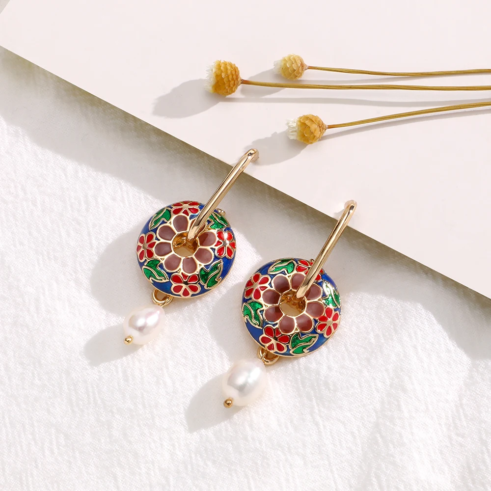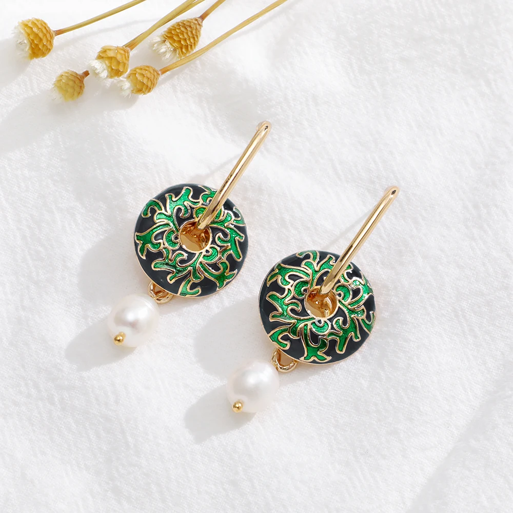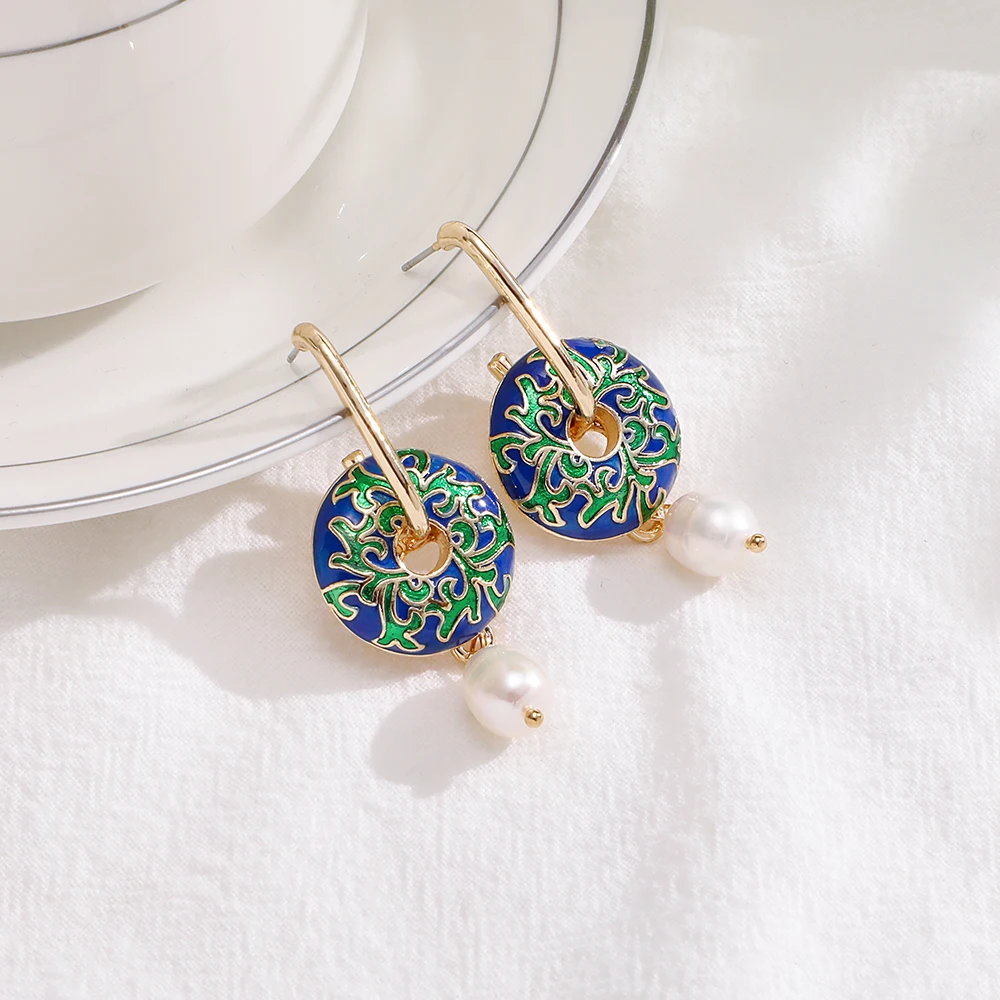 Эмалевые серьги-подвески, с цветными круглыми листьями, с жемчугом, свадебные украшения, 2020
