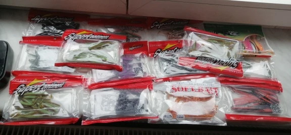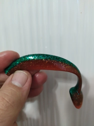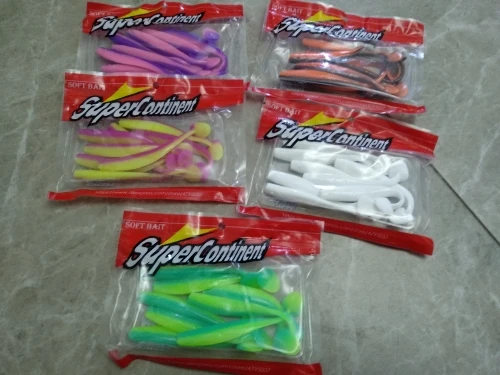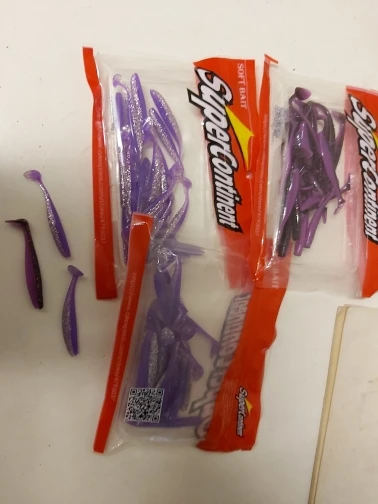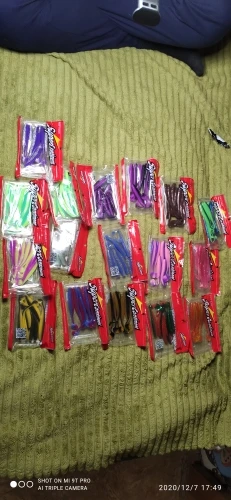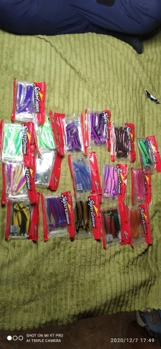 У этого продавца покупал три типа резины. Первая (оранжевое фото) в размере 90 и 50 мм - можно брать 90 и выше щучий размер , 50 окуневый (мелковатые). Вторая (фиолет) брал в размере 80 - тоже норм. Третья (сине - зеленое) брал в размере 50 и 75 мм - эти размеры в живую в руках смотрятся совсем мелкими. Длина разниться как в малую так и в большую сторону, короче третий тип не рекомендую... первые два можно брать. Атрактант есть, но резина сверху им облита. Один пакет с резиной был открыт, поэтому вся обработка высохла. Цвета яркие как на фото, резина сама мягкая - ловить будет. Ждем открытой воды.