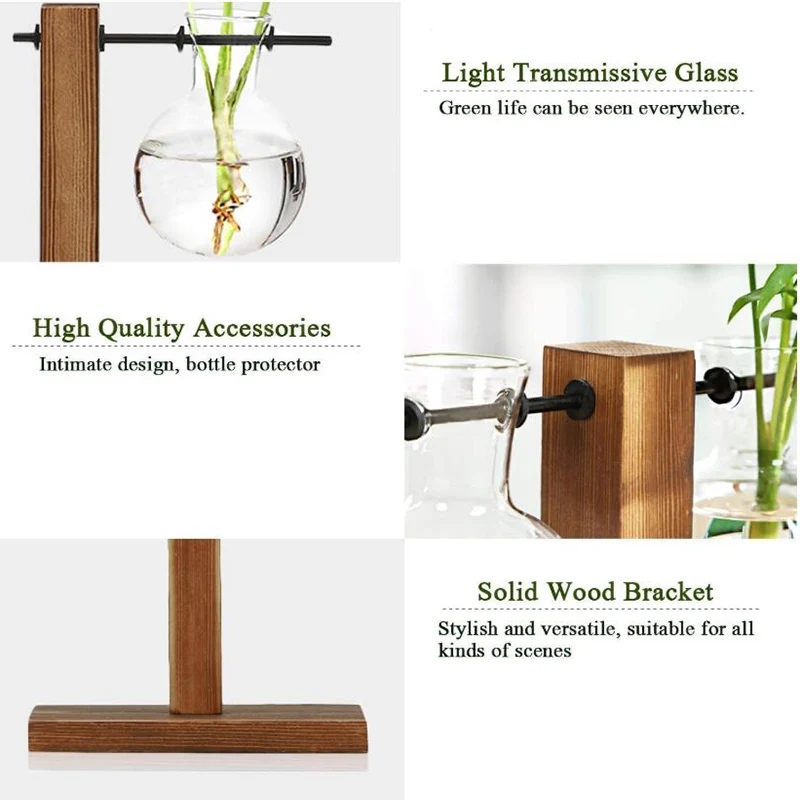 1. Простой внешний вид: высококачественные прозрачные стеклянные контейнеры в сочетании с деревянными рамами в стиле ретро делают ваши растения более красивыми. Он очень подходит, чтобы привнести чувство зеленого цвета в небольших пространствах (таких как книжные полки, настольные компьютеры или настольные компьютеры).