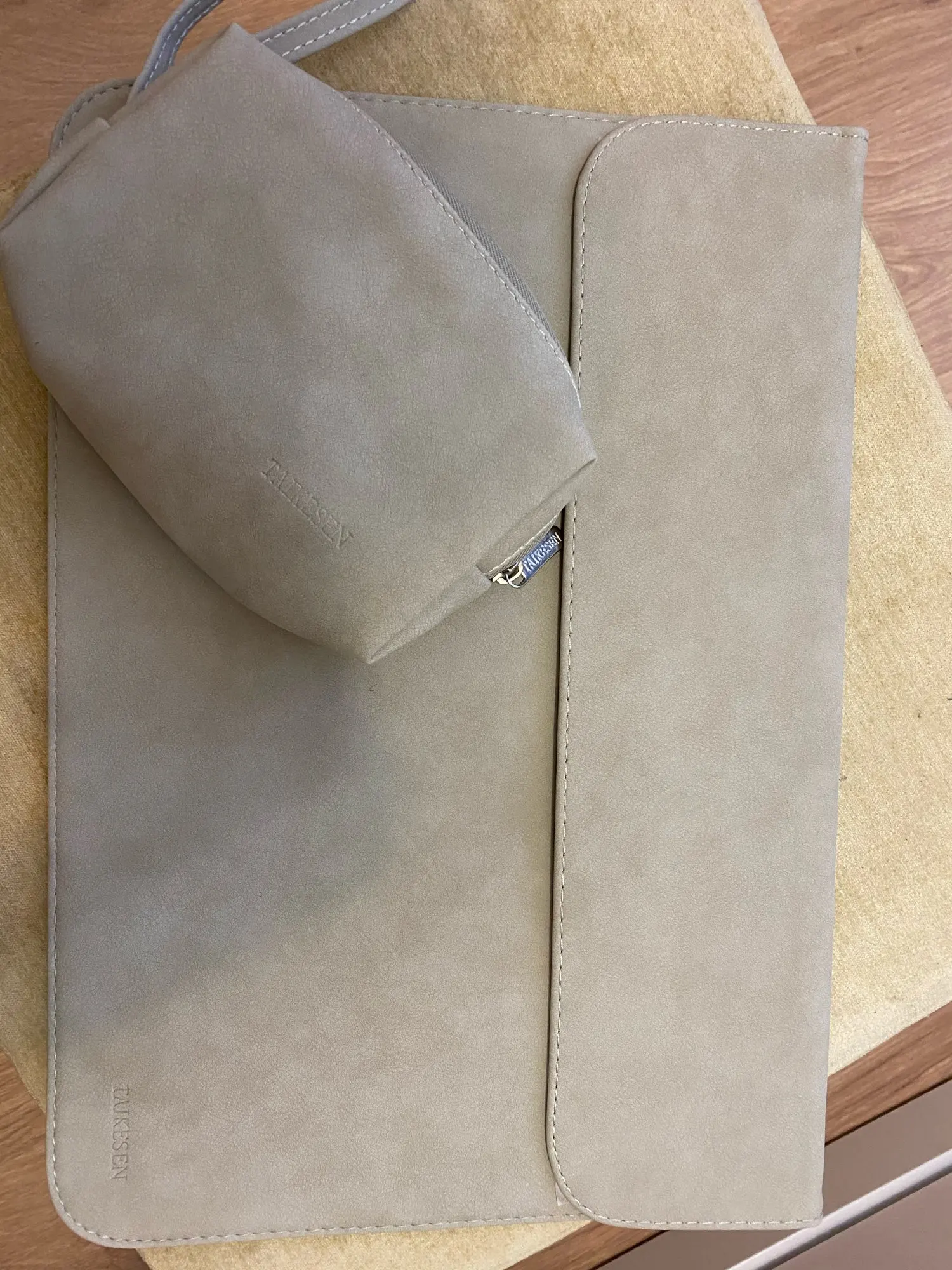 Отличное качество чехла! Прострочен ровно, ниток торчащих и заломов нет. Тактильно приятный материал. В сумочку помещается зарядное устройство и мышка. Цвет не чисто серый, чуть уходит в зелёный. Отлично подошёл на ноутбук ASUS ZenBook 14. Продавец отправил сразу после заказа. Рекомендую и магазин и чехол!