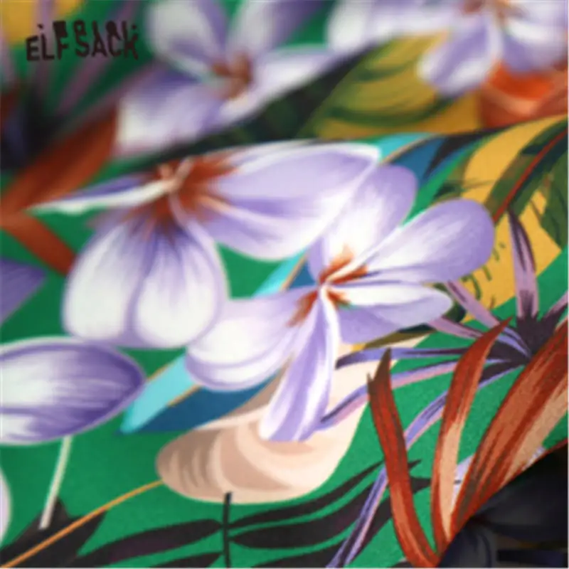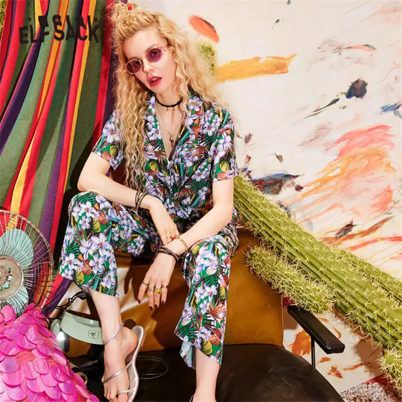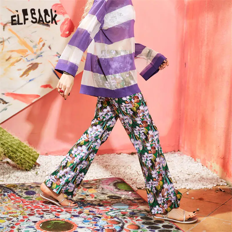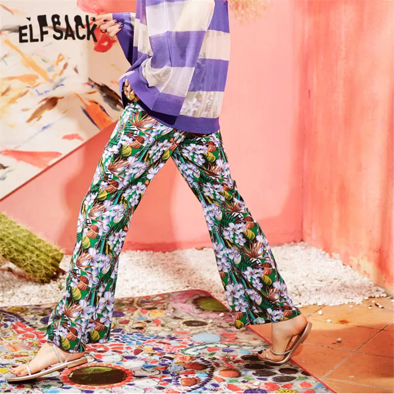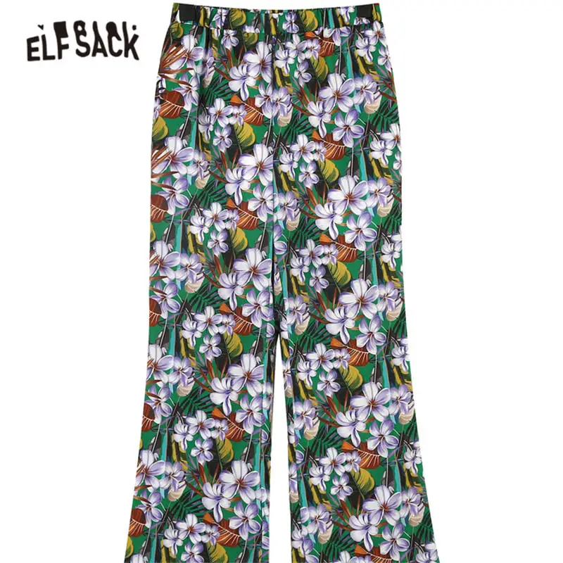 ELFSACKфиолетовые повседневные женские брюки с цветочным принтом в пляжном стиле; Винтажные брюки ELF с эластичной резинкой на талии в Корейском стиле; Сезон осень; Модель 2020 года