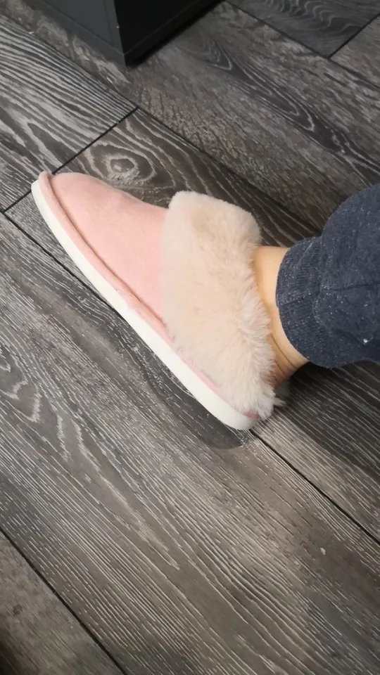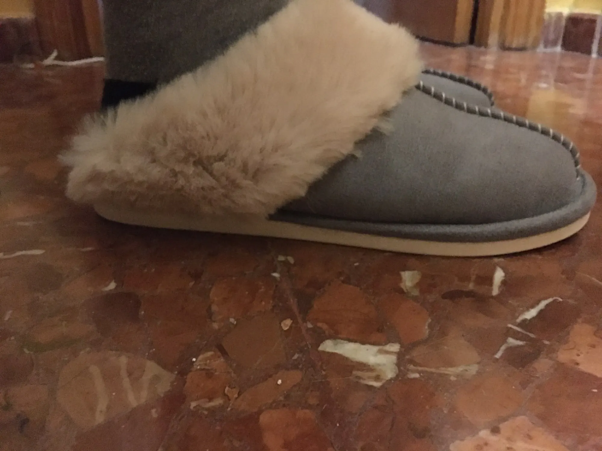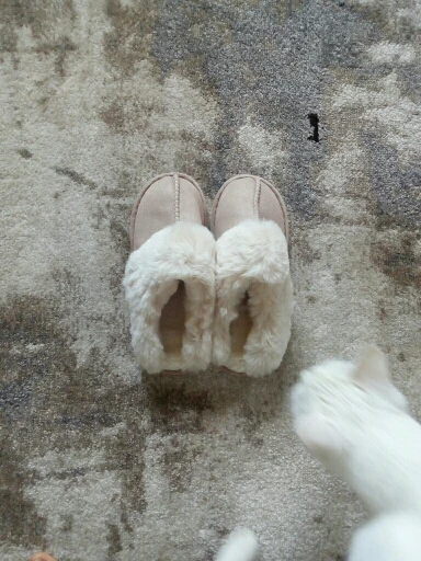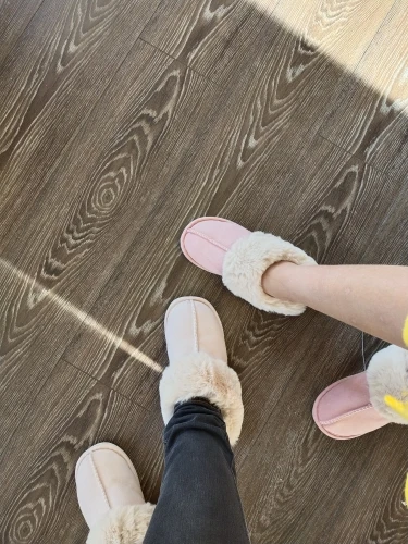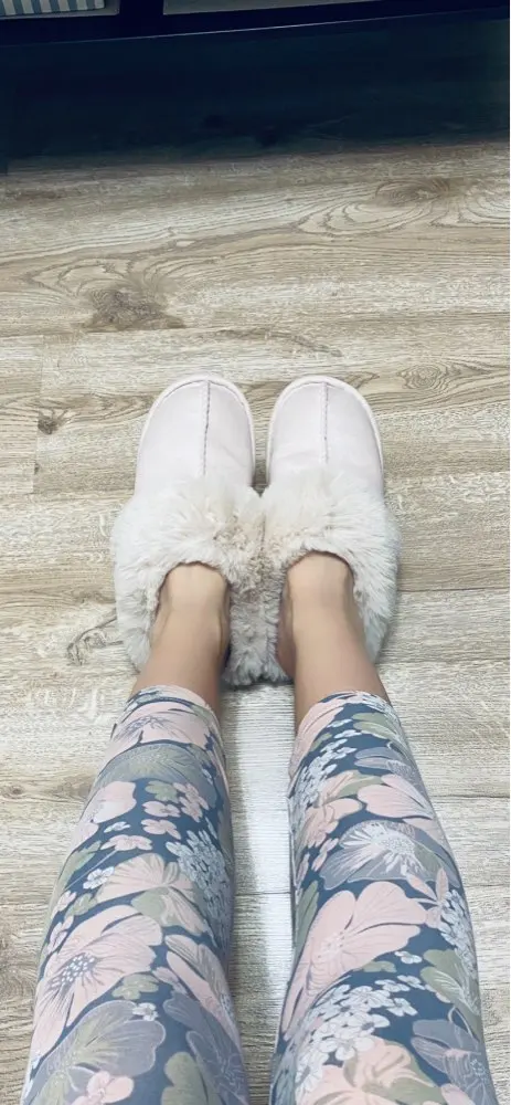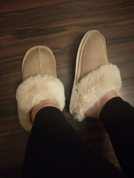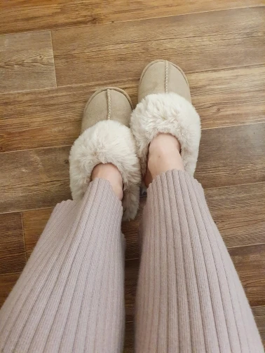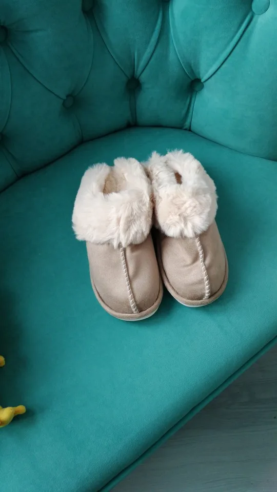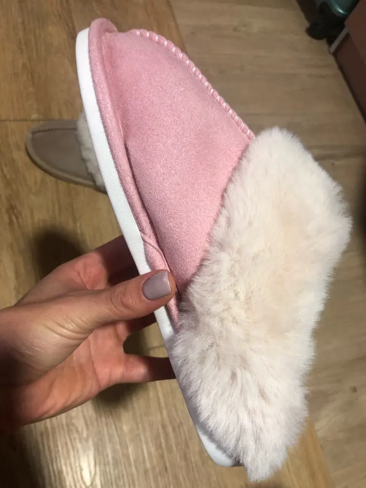 Милые тапочки, материал искусственный, поэтому может быть жарко, но смотрятся отлично. Есть несоответствие размерам на 1 см. Я получила размер 42-43, это 41-42 RU. Мой размер 40RU, однако село нормально. Внутри много меха, поэтому при носке нога смещается назад, но не выходит за пределы подошвы.