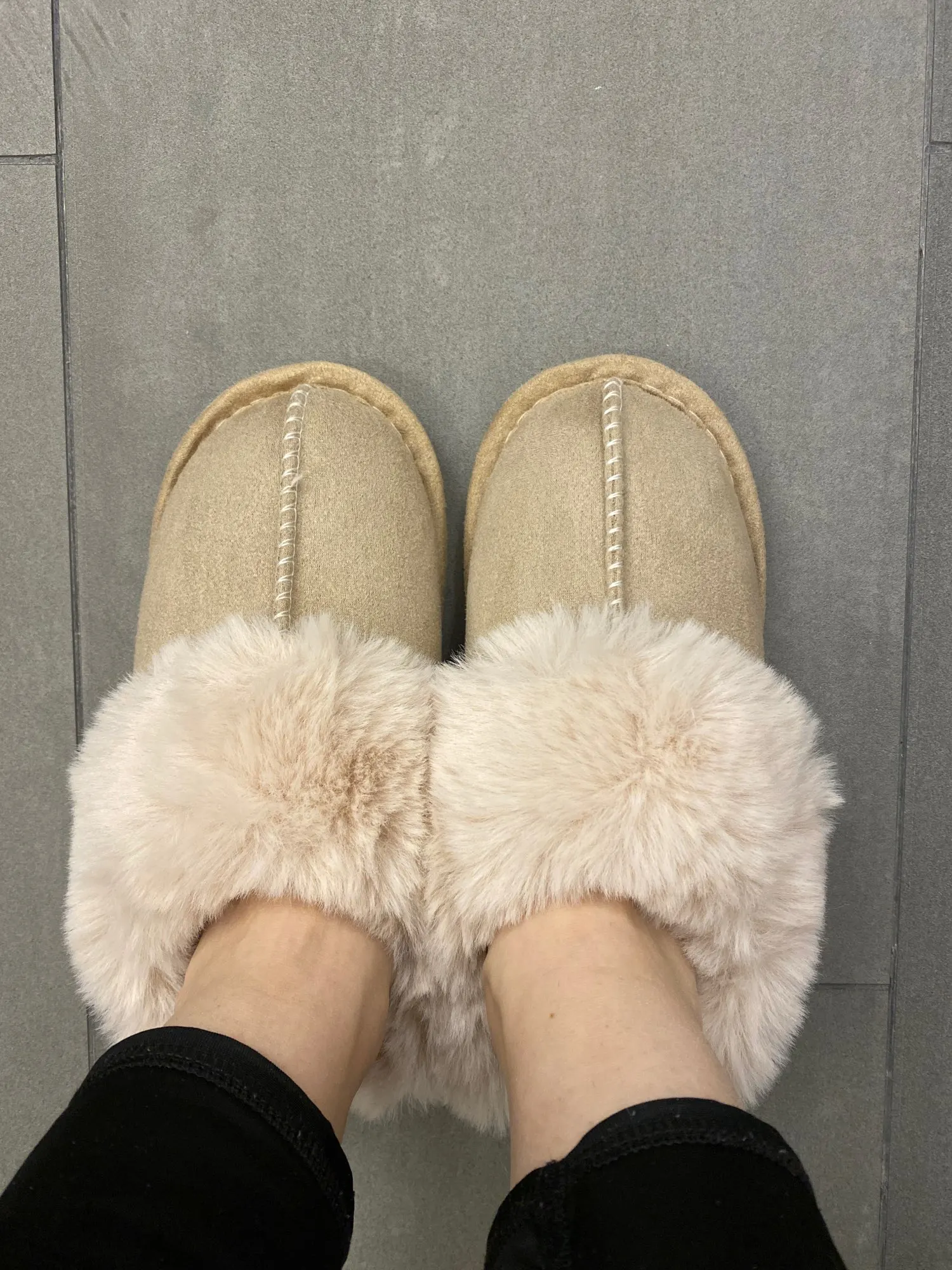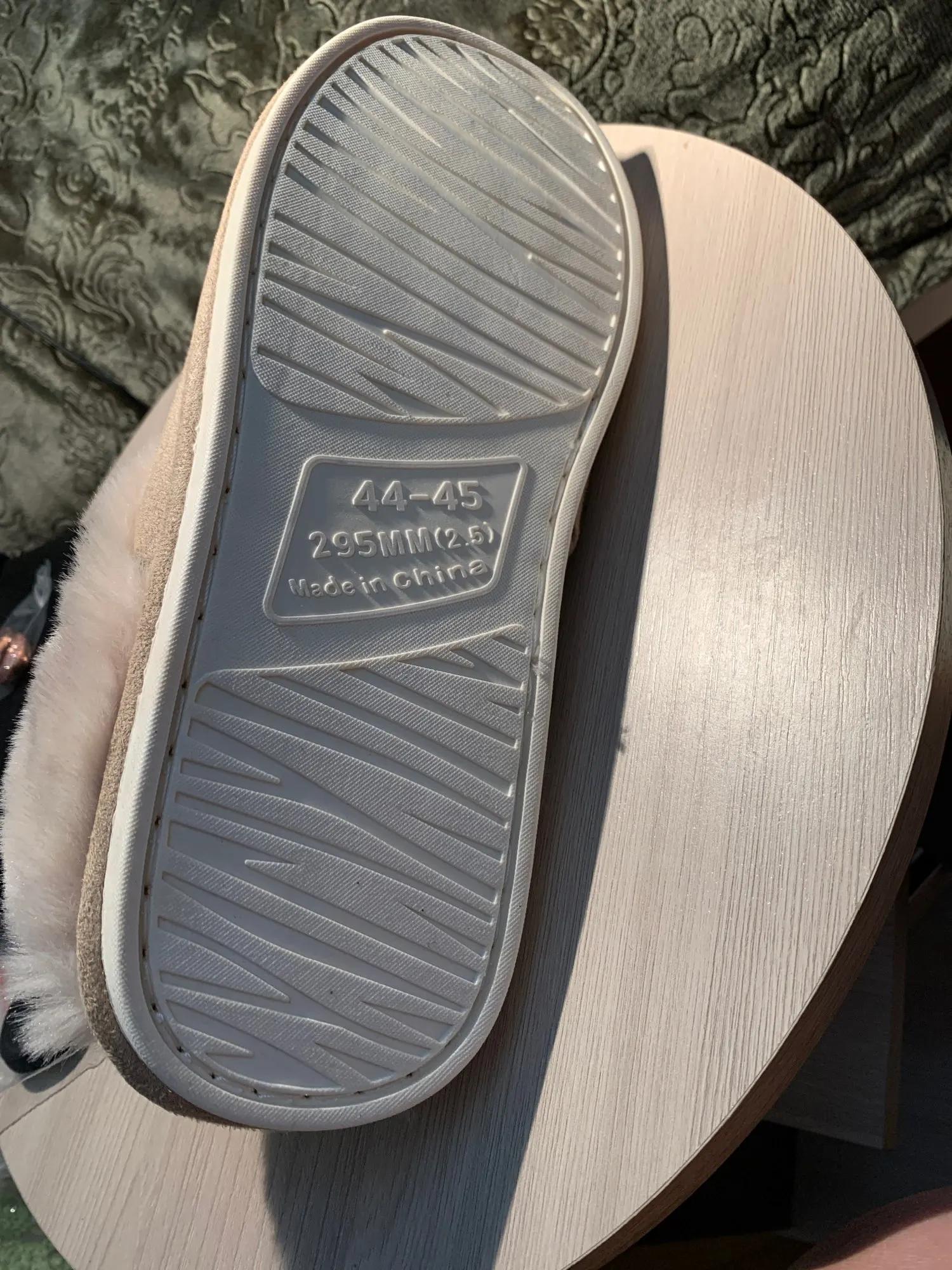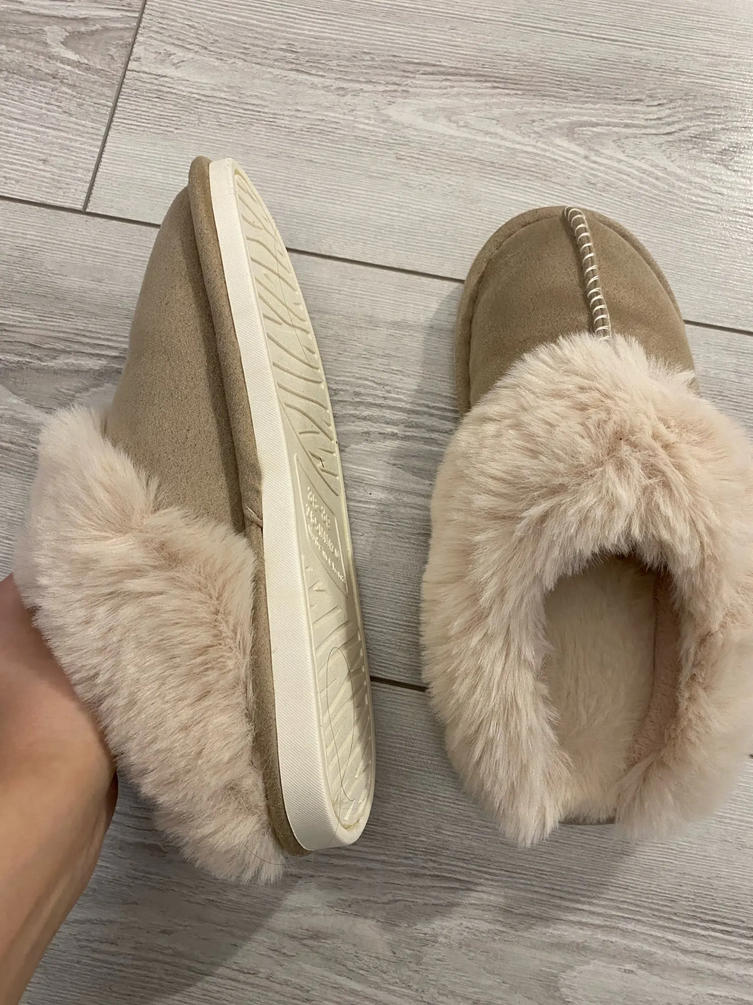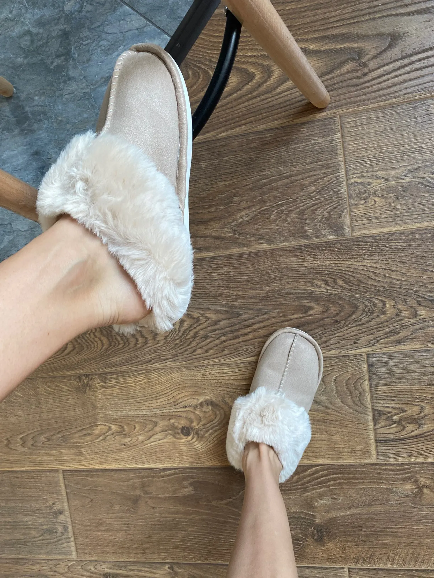 Милые тапочки, материал искусственный, поэтому может быть жарко, но смотрятся отлично. Есть несоответствие размерам на 1 см. Я получила размер 42-43, это 41-42 RU. Мой размер 40RU, однако село нормально. Внутри много меха, поэтому при носке нога смещается назад, но не выходит за пределы подошвы.