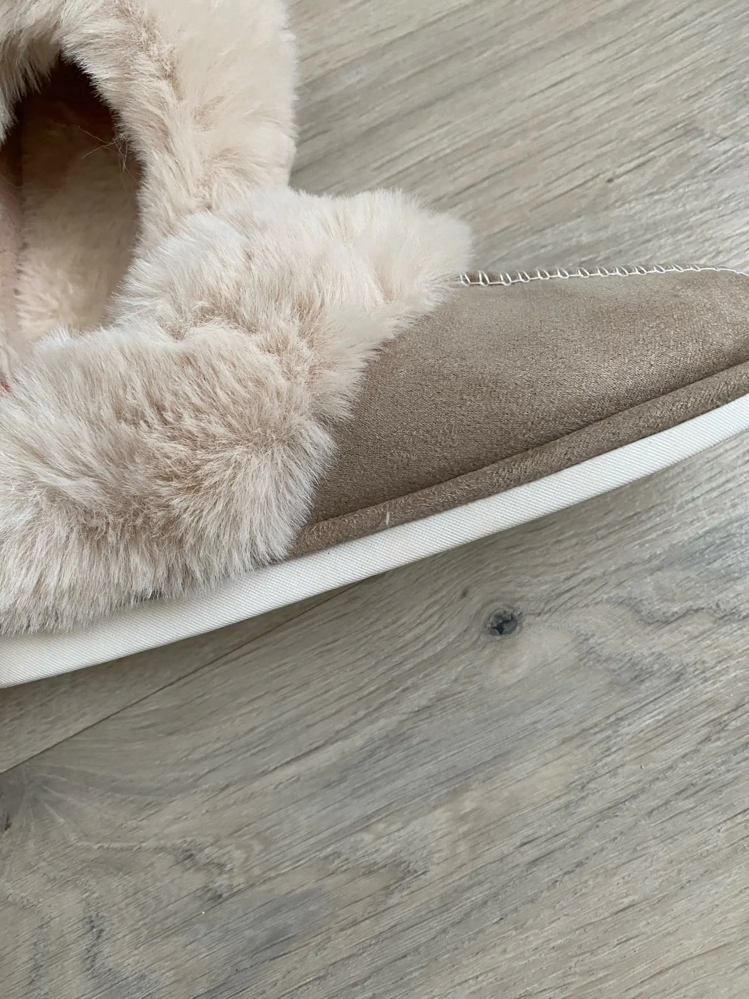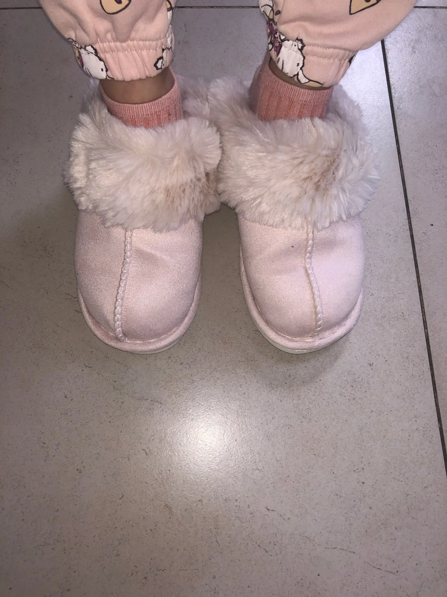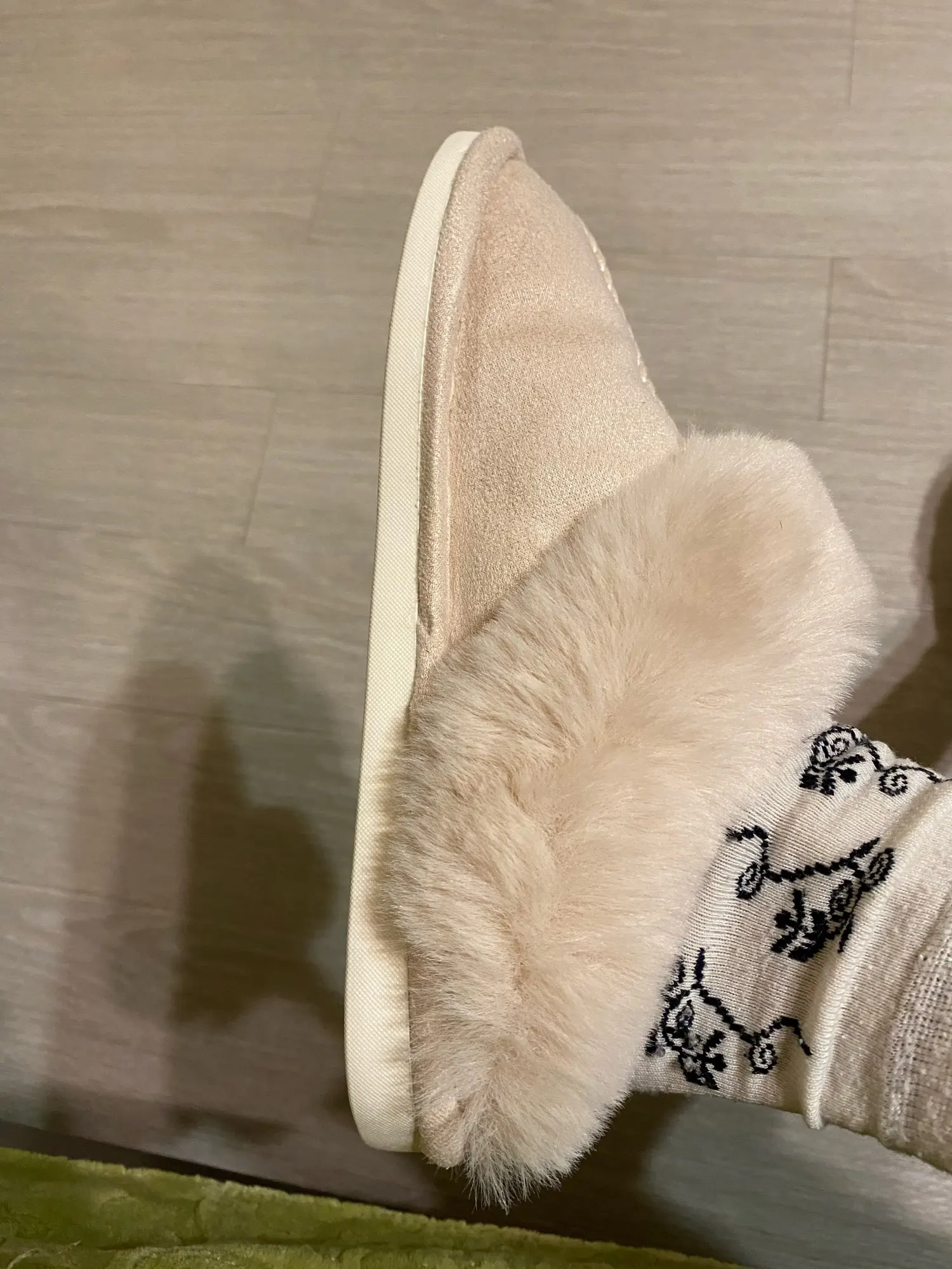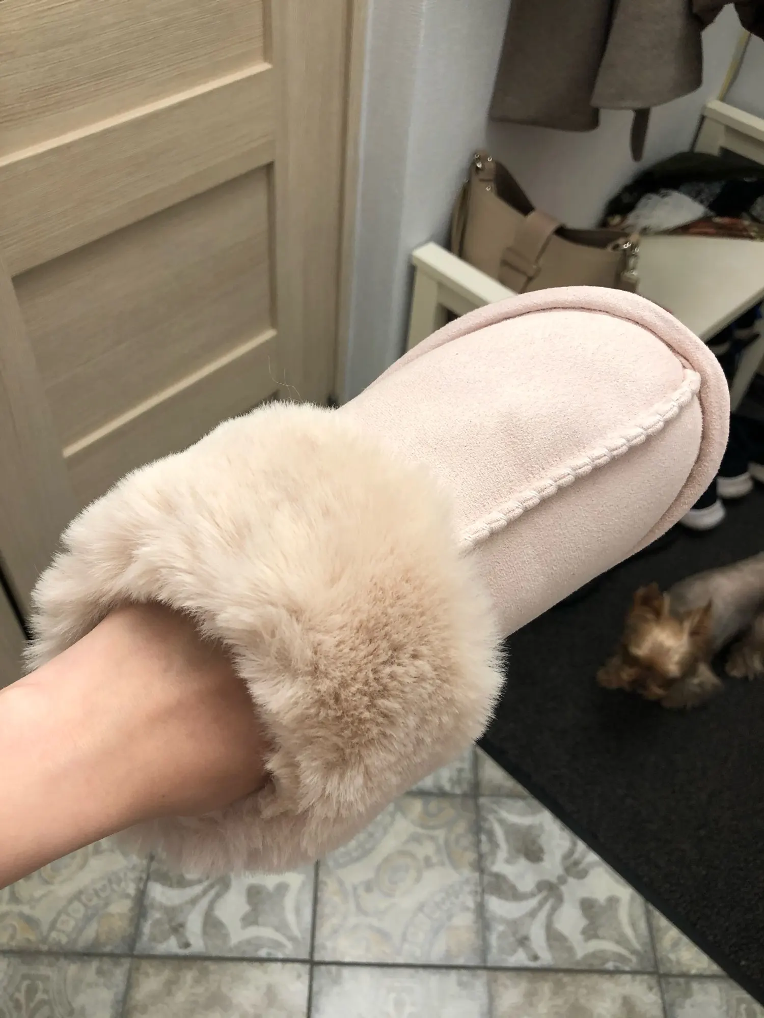 Милые тапочки, материал искусственный, поэтому может быть жарко, но смотрятся отлично. Есть несоответствие размерам на 1 см. Я получила размер 42-43, это 41-42 RU. Мой размер 40RU, однако село нормально. Внутри много меха, поэтому при носке нога смещается назад, но не выходит за пределы подошвы.