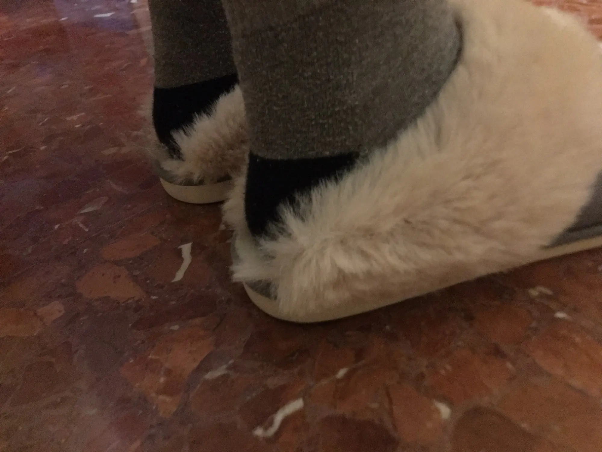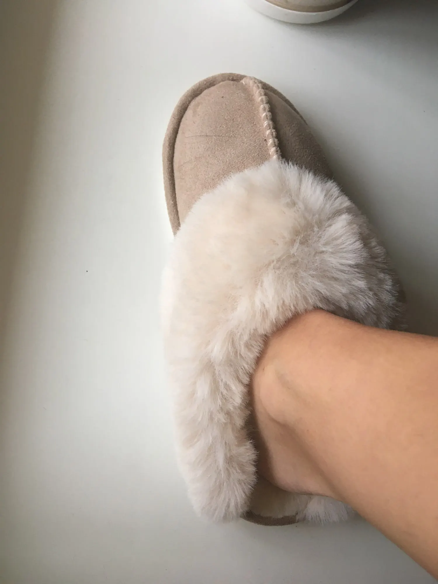 Мех искусственный. Нога потеет быстро. Швы не ровные. Тапкам Красная цена 3 доллара.