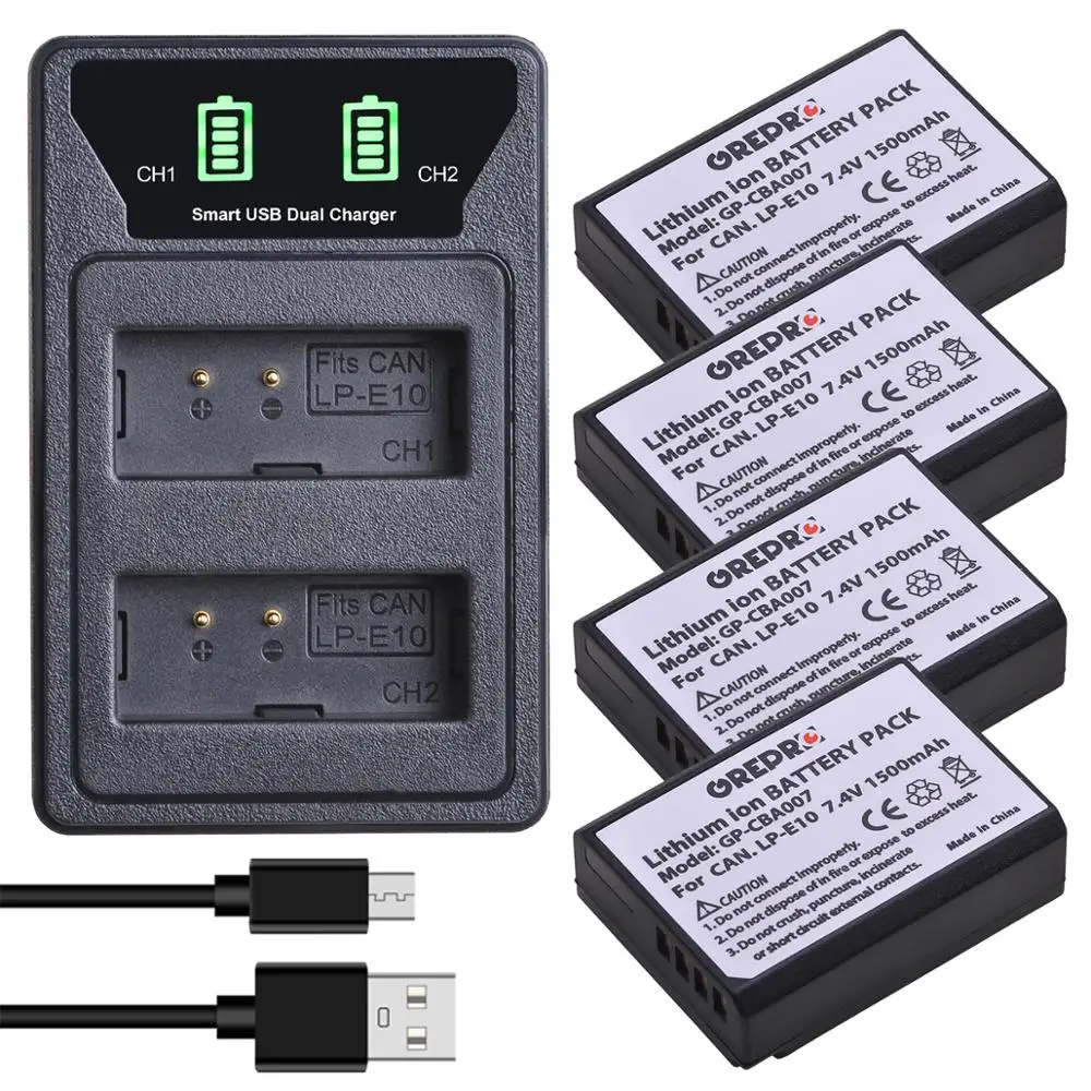 4 шт. 1500 мАч, LP-E10 LP E10 Батарея + светодиодный Dual USB Зарядное устройство для цифровой однообъективной зеркальной камеры Canon EOS 1100D 1200D 1300D 2000D Rebel T3 T5 T6 поцелуй X50 X70