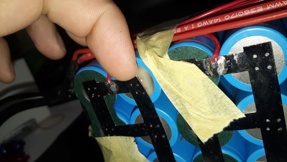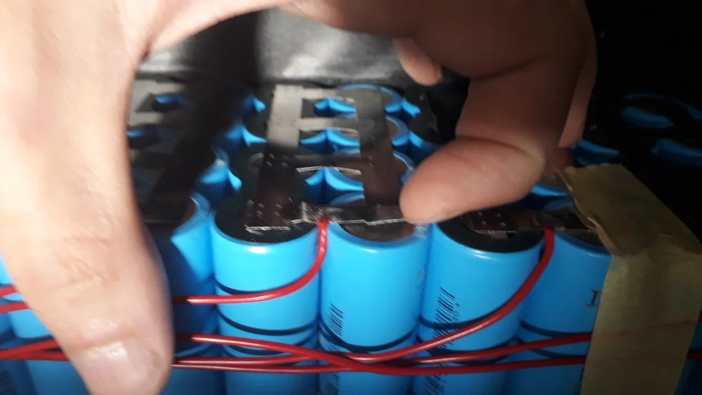 Батарея бракованная. Заряжалась до 51В, разряжалась до 44В (должна заряжаться до 54.6, разряжаться до 40). Ёмкость замерил и она оказалась 12.5Ач. Решил её разобрать. Оказалось, что лента очень слабо приварена к ячейкам и в 3х местах вообще не касалась их. Мало того, что батарея неправильно работал, так это ещё и крайне опасно. Если батарею зарядить, то свободная ячейка не зарядится, а потом от вибрации она может коснуться ленты и произойдёт замыкание. Использовать такую батарею нельзя.