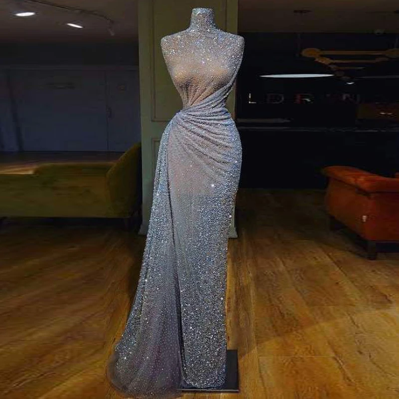 Женское блестящее длинное вечернее платье с высоким воротом, без рукавов