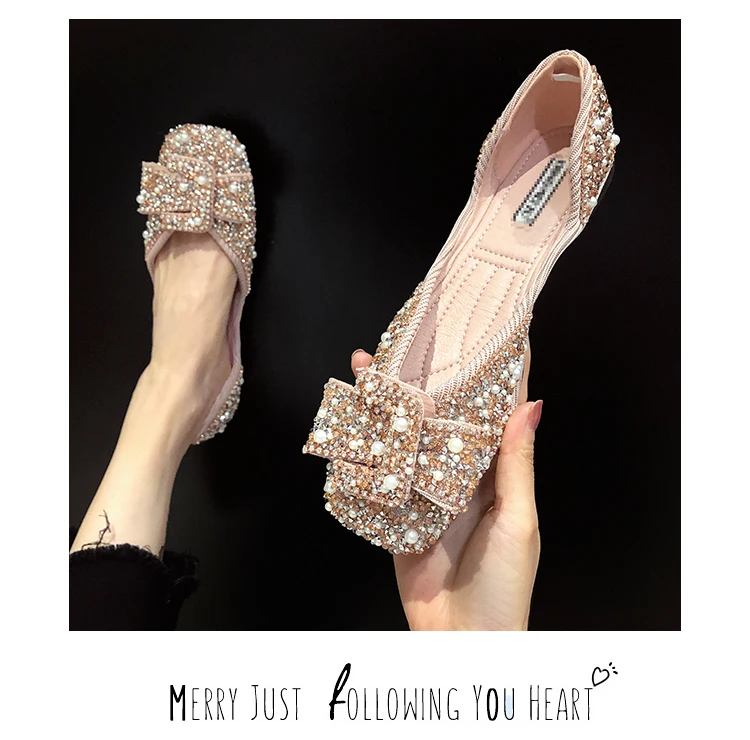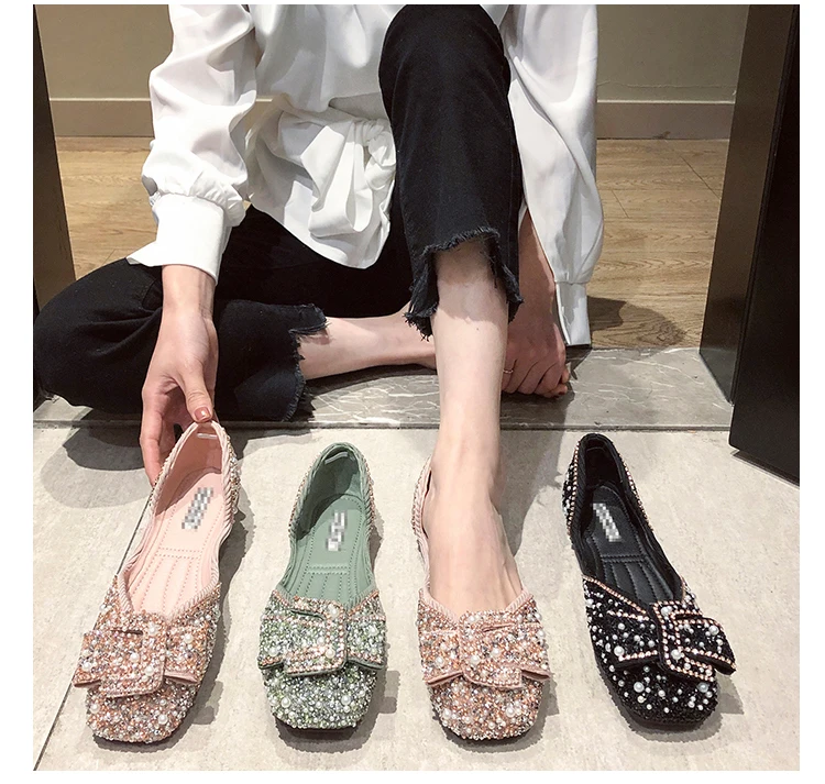 Женские туфли на плоской подошве, с кристаллами, жемчугом, бабочкой, обувь для женщин и девушек, мягкая подошва, квадратный носок, слипоны