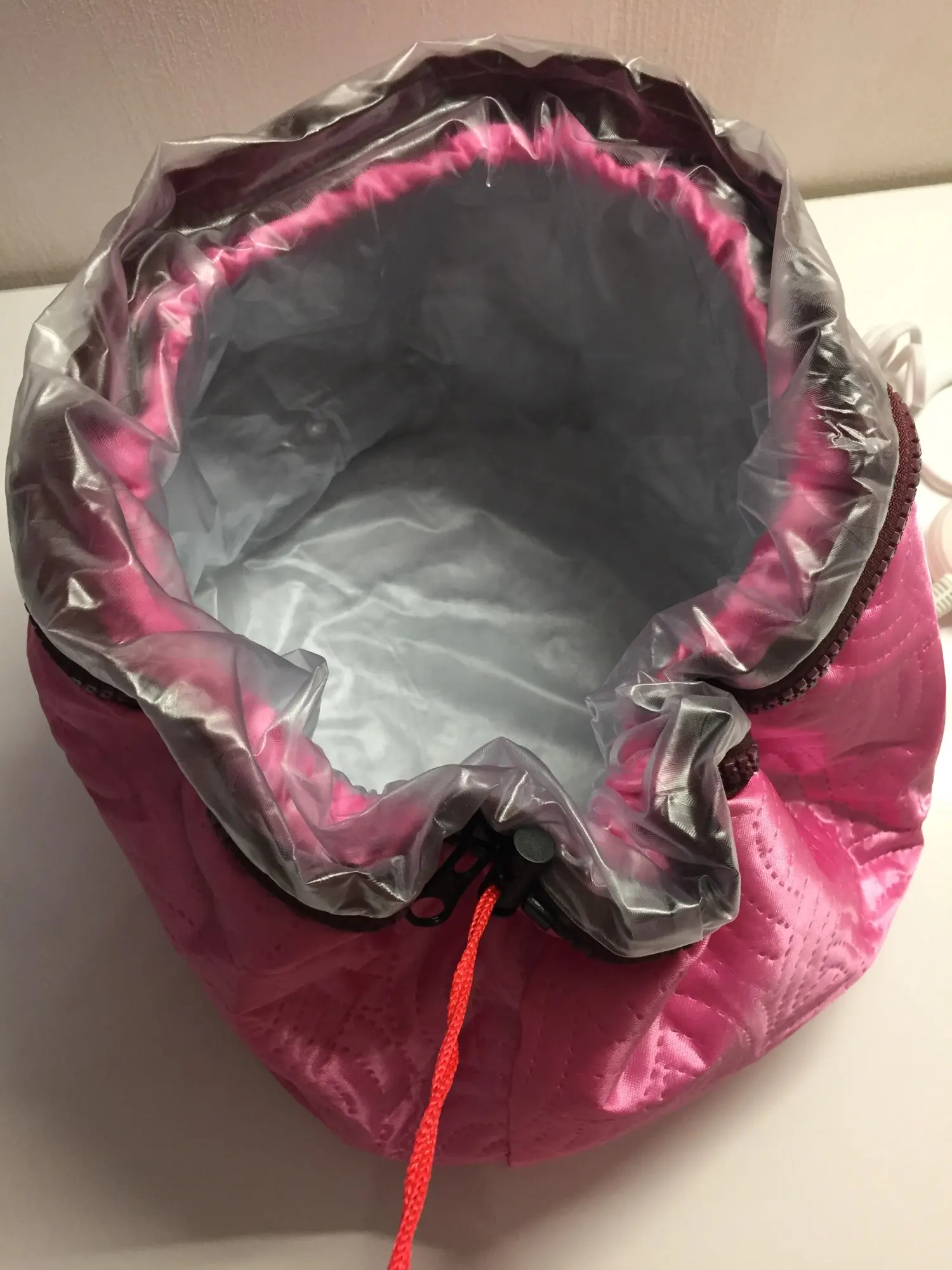 Очень быстрая доставка - 2 недели до РБ. Очень сильный химический запах внутри шапки - после первого применения почти пропал. Довольно глубокая, доходит до глаз, шнурком стягивается неплотно. Греет умеренно, голове комфортно. После первого применения (минут 30 с обычным бальзамом для волос) волосы гораздо меньше пушатся и мягче наощупь. Покупкой довольна, посмотрим, как долго проработает.