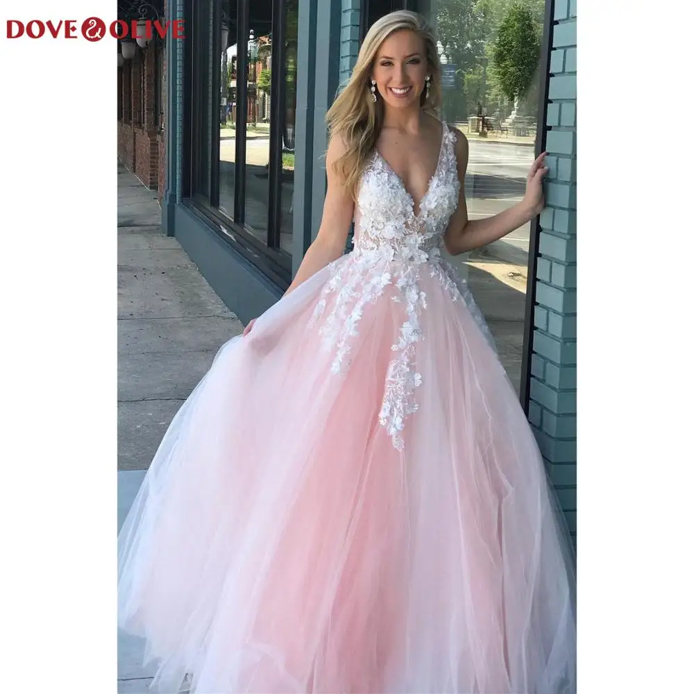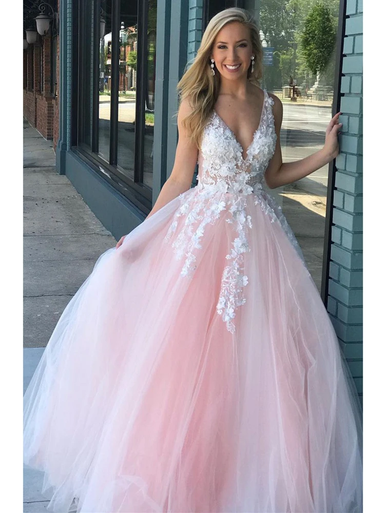 Кружевные цветочные платья для выпускного вечера, Длинные тюлевые платья трапециевидного силуэта без рукавов с глубоким V-образным вырезом, розовые вечерние платья для торжества, 2022