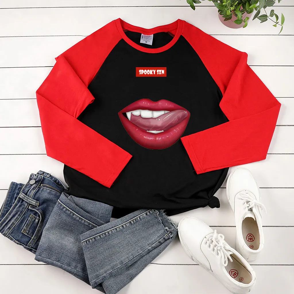 Женские Двухцветные Футболки с длинным рукавом Spooky Szn, с принтом красных губ, Осень-зима 2020